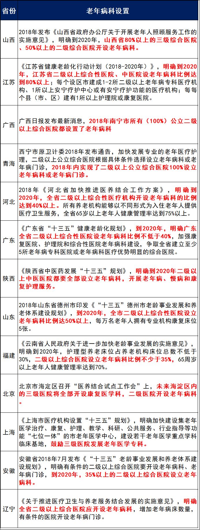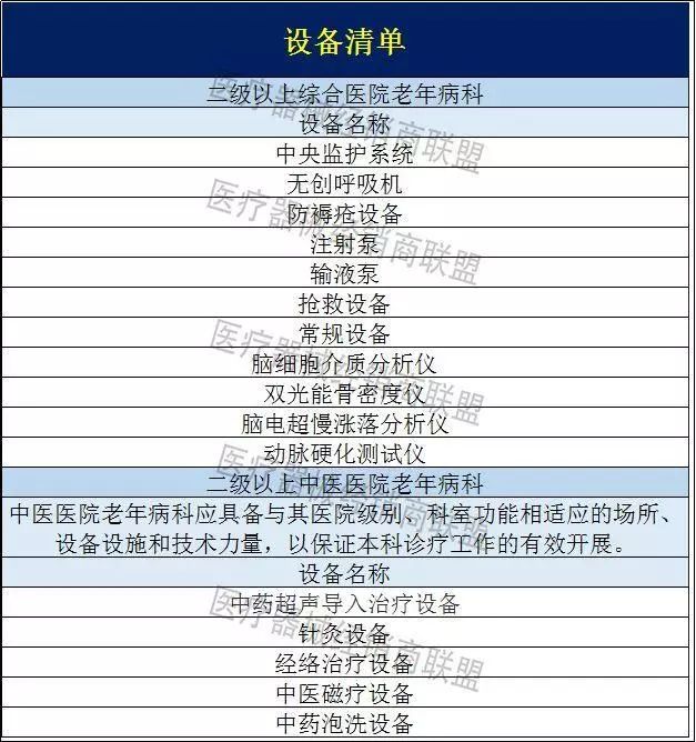 二级以上医院,100%新增设置这一科室!这些医疗设备需求将大量增加! 近日,河北省卫生健康工作会议在石家庄召开,研究部署2019年和今后一个时期全省卫生健康工作。其中明确提出加快发展为老服务专业医疗机构,二级以上综合医院全部都要开设老年病科!并且鼓励有条件的医疗机构设立养老机构或开设养老床位,依法依规开展养老服务。 河北省并不是开年首个提出全省二级以上医院都必须建立老年科的省份。早在今年1月份,甘肃省卫健委、民政厅在兰州召开全省医养结合工作推进会,会议上明确,甘肃省将确保到2020年,二级以上综合医院(含中医医院)全部建成老年病科! 也就是说到到明年底,甘肃全省100%二级以上公立综合医院都要设立老年病科! 早在2017年3月国务院印发的《“十三五”国家老龄事业发展和养老体系建设规划》中,就明确提出,到2020年35%以上的二级以上综合医院设立老年病科。 今年年初,国家国家卫健委老龄健康司副司长蔡菲在中日养老服务业合作论坛上再次明确,要建立完善综合连续的整合型老年健康服务体系,在二级以上综合医院设立老年病科。以老年健康需求为导向,加强老年病医院、康复医院、护理院、安宁疗护等接续性机构建设。 而开年以来,多个省份就明确提出要在二级以上医院全部建立老年科,可见从今年起,二级以上老年科的建设将在全国范围内遍地开花! 据十三五老龄规划显示,预计到2020年,全国60岁以上老年人口将增加到2.55亿人左右,占总人口比重提升到17.8%左右;高龄老年人将增加到2900万人左右。老年抚养比将提高到28%左右;用于老年人的社会保障支出将持续增长。 中国老龄人口健康问题多,其中慢性病患病率高,是影响老年人群健康的主要问题。心脑血管疾病、恶性肿瘤、呼吸系统疾病是我国老年人群死亡的前三位原因。 随着人口老龄化特点加剧,老年病人也越来越多,人们对于老年病科有巨大的需求! 国家政策出台后,各省市也明确二级以上要设置老年病科,从各省市的的十三五规划来看,诸多省市比国家要求的比例更高! 随着老龄化加剧,二级以上老年病科的设置会越来越多! 13省、直辖市老年病科设置情况 老年病科之前,国家要求二级以上医院必须建立康复科,而这带动了全国康复医疗器械市场的快速增长。 按照全国有5500家医院需要建设或者完善康复科(2018年,中国有2433家三级医院,8056家二级医院,按照50%待建科室计算,一共是5500左右医院),单个医院平均投入400万元,康复器械的市场规模将扩张至200-300亿。 而随着全国范围内老年病科建设开始如火如荼的开展,全国政协委员、四川省卫健委主任何延政提出:建议每个市(州)和人口较大的县至少建立一家政府举办的老年病医院,引导符合条件的二级医院转为老年病医院;加强三级以上综合医院老年重点疾病专科建设。统筹各级财政涉老资金,参照国家对养老服务体系建设的投入模式,各级财政按每张老年病床位按一定标准进行建设补贴。 随着老龄化加剧,老年病科、老年医院建设将会大量增加!而相关医疗器械配置同样也会迎来扩容! 那么老年病科主要治疗哪些疾病,需要配置哪些医疗设备呢? 老年病科的主要治疗内容 一般60岁以上,称为老年,老年期所患的疾病或老年期多发的疾病,包括从青中年就可发生的疾病,到老年期更易发,如慢阻肺、高血压、糖尿病、动脉硬化、冠心病等,其次是在器官老化基础上发生的疾病,包括老年痴呆、骨质疏松、白内障等,还有因衰老使机体功能减退而发生的急性疾病,如老年人肺炎、急性泌尿道感染等感染性疾病。 那么哪些设备是老年病科需要配置的呢? 本清单可供参考: |