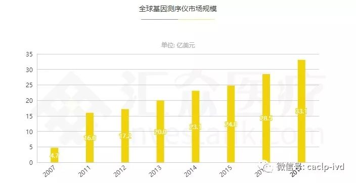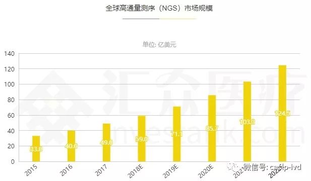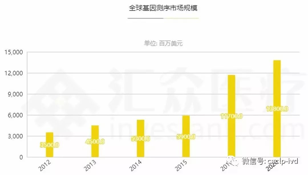 来源:汇众医疗 随着测序技术的不断成熟以及政策的逐渐放开,基因测序在疾病早筛、微生物、遗传学检测等领域应用前景广阔,整个行业开始高速发展。随着“精准医疗”的深化,基因测序逐渐成为科技医疗领域备受瞩目的话题,得益于平台技术的进步、测序应用的拓展、各机构合作的拓宽以及测序成本的下降,行业正在以惊人的速度发展。 2005年首代测序仪Roche454单次产生400MB的基因序列文件,到2010年第二代测序仪IlluminaHiseq2000单次能产生200GB的基因序列文件。技术的高速发展,让基因测序的速度在5年时间里提升了500倍,全基因组测序的时间成本也从11年降至几周。 此外,基因测序的成本也在不断下降。“100美元完成一个人全基因组测序”是基因测序行业的共同目标,全球基因测序从业者都在为此冲刺。2006年,全基因组测序费用从最初的上亿降至2000万美元。2007年,第二代基因测序技术出现,生物技术公司 Knome 以35万美元的价格提供了第一项直接面向消费者的基因组测序服务。2008年,全基因组测序成本降至20万美元。2010年,Illumina以每人5万美元的价格向消费者提供了个人基因组测序服务。2017年1月,全球基因测序龙头Illumina发布新一代测序仪NovaSeq时,对外口径是“Novaseq能让基因组测序进入100美元的时代”。 数据来源:汇众医疗-因钽数据 随着测序技术的不断成熟以及政策的逐渐放开,基因测序在疾病早筛、微生物、遗传学检测等领域应用前景广阔,整个行业开始高速发展,2012年全球基因测序市场规模为35亿美元,截至2015年已上涨到59亿美元,3年增长为原来的1.69倍,复合年平均增长率19.0%,预计2018年达到117亿美元,2020年将达到138亿美元。 Illumina公司则认为基因测序服务市场的容量有200亿美元,其中肿瘤学120亿美元、生命科学50亿美元、基因健康与生育方面20亿美元,其他方面10亿美元。 基因测序技术发展已有40年历史,根据测序原理的不同,基因测序技术被分成了3代:第一代基因测序Sanger(双脱氧测序法),第二代基因测序NGS(下一代测序技术,又称高通量测序技术),第三代基因测序TGS(单分子测序技术)。 由于技术优缺点的不同,3代技术被应用于不同的领域。目前,第二代测序技术是商用的主流技术,三代测序技术也是未来的趋势,五到十年内市场会出现二代与三代测序技术并存的状态。 数据来源:汇众医疗-因钽数据 2015年二代测序(NGS)市场规模达33亿美元。2019年3月,市场调研机构Grand View Research预测,在未来几年,新一代测序(NGS)市场将以12.78%的复合年增长率快速增长,2025年预计将达到197亿美元,在全球基因测序市场规模中占比近90%。 数据来源:汇众医疗-因钽数据 基因测序产业链主要由上游基因测序设备制造厂商;中游为面向终端用户的测序服务机构及生物信息分析机构;下游则为基因测序服务的使用者,包括医疗机构、科研机构、制药公司和个人用户等。 测序仪生产商主要被Illumina、ThermoFisher、罗氏等跨国巨头垄断,国内基因测序行业头部公司如华大基因、贝瑞基因等。上游生产商决定了中游服务细分赛道的市场容量、发展前景及业务模式特点。所以,基因测序仪不仅支撑整个中下游的测序服务,是整个产业链的起点同时也是其中的一个最重要的环节。 2007年全球基因测序仪的市场规模仅4.7亿美元,2017年则增长至33亿美元,涨幅高达602%,复合年平均增长率为21.55%,预计2020年市场规模将接近60亿美元。 数据来源:汇众医疗-因钽数据 从整体市场占有率来看,超过80%的营收被Illumina所垄断,紧随其后的Themo Fisher市场占有率仅为不到10%,Roche仅为5%左右,而排名第四的Pacific BioSciences仅占不到1%,排名前四的厂商总市场占比超过99%。 从产业链整体上看,产业链上游的基因测序仪及配套试剂是整个产业链壁垒最高的部分。鉴于成本和技术难度等问题,国内进行测序设备研发的企业数量并不多。此外,技术发展初期,国外公司多以自主研发为主,逐渐走向并购整合道路,大公司的先发优势和技术壁垒早已建立,短期国外寡头垄断格局将持续,新进入者的机会渺茫。 2018年,整个基因测序行业依旧朝着100美元的目标前进。 Veritas Genetics公司在2018年11月以199美元限时向全美前1000名客户提供包括结果解读的myGenome Standard全基因组测序服务,上线仅6小时被抢购一空。该公司首席执行官Mirza Cifric表示,“我们正在向医学研究界发出一个明确的信号——99美元的基因组测序将在未来3-5年内出现。而人们可能认为还需要10年时间,我们的目的是唤醒他们。” 生物技术网站genengnews(GEN)认为,推动测序成本不断降低的竞争可能很快被另一种竞争所取代,在这种竞争中,各大公司会根据自身的能力相互竞争,以整合更强大的解读工具、更优异的服务。这就要求所有的测序公司,尤其是GEN排名的前十大供应商,在努力吸引客户时,在努力追求最低价格时,目光不仅仅局限于临床研究实验室,而是放到更广阔的领域。 近日,GEN网站推出“Top 10 Sequencing Companies”榜单(按公司近12个月收入进行排名),盘点了全球测序行业10大巨头,在名单中,GEN官网罗列了全球10大顶尖测序公司,包括公司简介、2018年收入等信息。 1.Illumina 2018年收入33.33亿美元 Illumina公司首席执行官Francis DeSouza在摩根大通第37届医疗保健会议上对分析师表示,该公司仍在努力将测序成本降低至100美元,但并没有透露公司何时交付。Illumina认为,其仪器在临床环境以