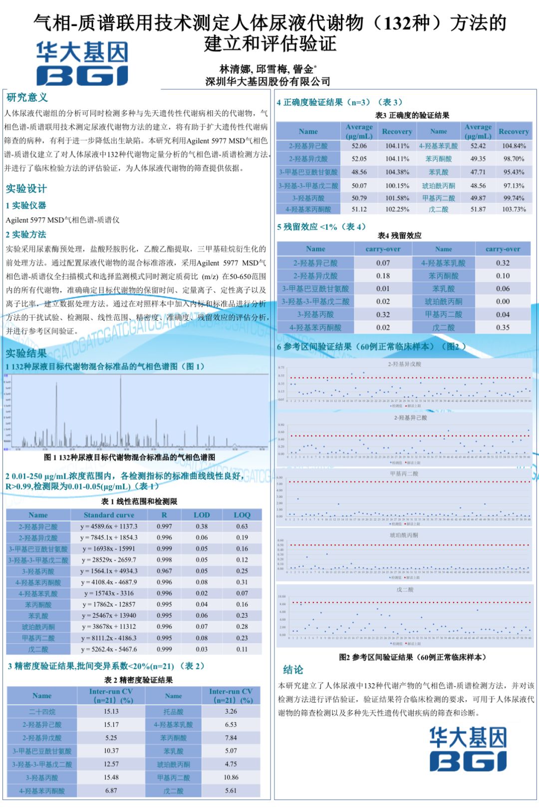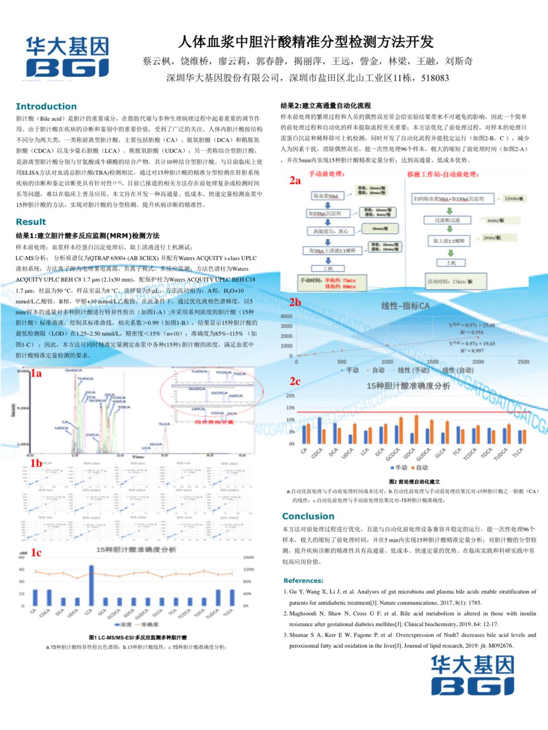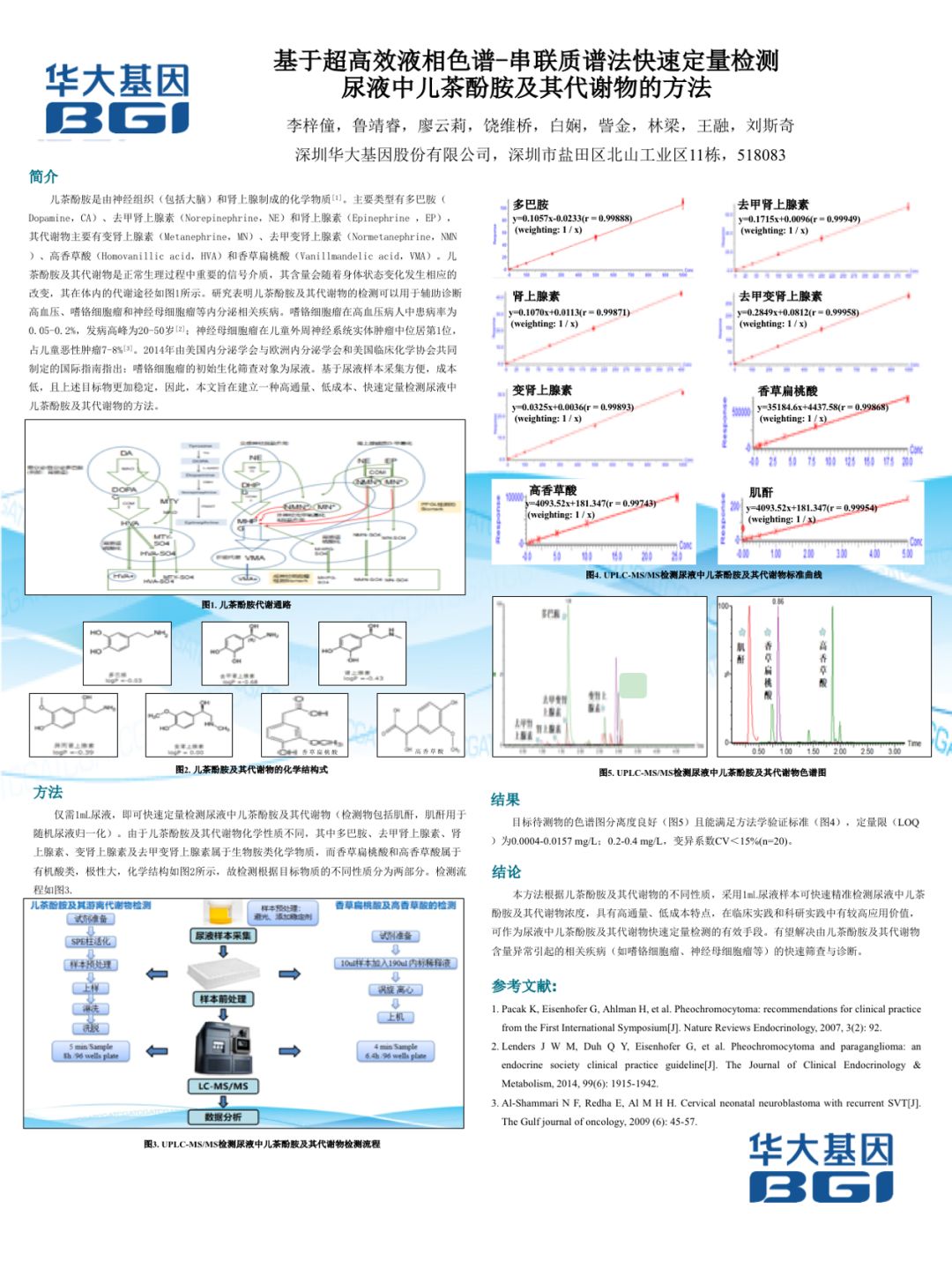第一届中国生物物理学会代谢组学分会年会暨2019代谢组学国际研讨会,于2019年4月18日-4月21日在上海举行。此次会议由中国生物物理学会代谢组学分会主办,复旦大学人类表型组研究院承办。会议围绕代谢组学检测新技术及其在健康、疾病、植物、食品、肿瘤代谢机制方面的研究和应用等主题展开。 华大基因质谱团队将在会议期间呈现一场主题为“从疾病代谢组学探讨健康管理“的报告,与专家学者们一起,依托现有的疾病代谢组学研究方法,探讨高尿酸的预防和管理方案,并以Poster形式展出华大质谱平台的7项最新研发成果。 以下是Poster展出研发成果概述: 人体抗生素残留检测 抗生素能抑制或杀灭微生物(包括细菌、真菌、放线菌属),而它本身正是由微生物产生,在医院日常抗感染类药物当中用量最大。据报道,当前中国住院患者抗生素使用率高达80%,远超国际平均水平——30%,滥用现象相当普遍。同时食品、水体等环境中的抗生素也不断向人体内富集,影响人体正常生理机能,尤其对婴幼儿的生长发育不利。抗生素的种类繁多,然而当前在人体抗生素残留检测方面缺乏一次检测多种不同抗生素的方案。该项研究克服了不同种抗生素化学性质差异大的困难,建立了一种高通量、低成本、快速的尿液抗生素含量检测方法。该方法精密度、准确度高,重现性良好,能一次性快速精准检测尿液中常见的40种抗生素含量,为人体抗生素残留检测提供了一种简便可行的解决方案,在科研和临床实践中有较高的应用价值和较好的应用前景。 儿茶酚胺及其代谢物检测 儿茶酚胺由神经组织(包括大脑)和肾上腺产生,主要包含多巴胺、去甲肾上腺素、肾上腺素、变肾上腺素、去甲变肾上腺素、高香草酸和香草扁桃酸。这7种物质是正常生理过程中的重要信号介质,它们的含量会随身体状态变化而改变。研究表明,这7种物质的检测可以用于辅助诊断高血压、嗜铬细胞瘤和神经母细胞瘤等内分泌相关疾病。2014年,由美国内分泌学会与欧洲内分泌学会和美国临床化学协会共同制定的国际指南指出:嗜铬细胞瘤的初始生化筛查对象为尿液。基于尿液样本采集方便、成本低,且上述目标检测物更加稳定。该项研究建立了一种方法,采用1mL尿液样本即可快速精准检测尿液中儿茶酚胺及其代谢物的浓度,高通量、低成本,可作为尿液中儿茶酚胺及其代谢物快速定量检测的有效手段,有望解决由儿茶酚胺及其代谢物含量异常引发的相关疾病(如嗜铬细胞瘤、神经母细胞瘤等)的快速筛查与诊断。 132种尿液代谢物定量检测 人体尿液代谢组可检测多种与先天遗传性代谢病相关的代谢物,气相色谱-质谱联用技术测定尿液代谢物方法的建立,将有助于扩大遗传性代谢病筛查的病种,有利于进一步降低出生缺陷。该项研究基于Agilent 5977 MSD气相色谱-质谱仪,建立了对人体尿液中132种代谢物定量分析的气相色谱-质谱检测方法,并进行了临床检验方法学评价,验证结果符合临床检测要求,证明该方法可用于人体尿液代谢物的筛查检测以及多种先天性遗传代谢疾病的筛查和诊断,在科研和临床实践中有较高的应用价值和较好的应用前景。 全血中5种免疫抑制剂定量检测 免疫抑制剂是可抑制细胞及体液免疫反应,使组织损伤得以减轻的一类物质,临床主要应用于器官移植抗排斥反应和自身免疫性疾病的治疗。但这类药物治疗窗(药物有效的浓度区间)窄,在不同个体间作用差异大,必须通过密切检测血药浓度、实施个体化用药来保障药物治疗安全性和治疗效果,这是免疫抑制剂未来的发展方向。目前,临床上常用且推荐在治疗中进行药物监测的免疫抑制剂主要有5种:环孢霉素A、他克莫司、西罗莫司、依维莫司和霉酚酸,它们作用于免疫反应的不同时期,可发挥协同作用。临床上会根据病情和治疗阶段不同,采取单用或联合用药的不同方案来提高治疗的有效性和安全性。该项研究针对免疫抑制剂的临床定量监测需求建立了一种方法,仅需20 μL全血样本,通过蛋白沉淀方法提取其中的免疫抑制剂,应用UPLC-MS/MS同时快速精准检测5种免疫抑制剂浓度,可实现单样本多指标同步定量检测,具有高通量、高时效等特点,为个体化用药提供了有效的血药浓度检测方案,对临床样本检测和治疗药物监测有较高应用价值。此外,BGI具备完善的平台,可根据项目需求,提供精准定量分析的解决方案,为科研助力。 5 min内完成 15种血浆胆汁酸精准定量分析 胆汁酸是胆汁的重要成分,在脂肪代谢与多种生理病理过程中起着重要调节作用,在疾病诊断和鉴别中具有重要价值,因而受到广泛关注。人体内胆汁酸按不同结构分为两大类,一类称为游离型胆汁酸,主要包括胆酸、脱氧胆酸、鹅脱氧胆酸、石胆酸和熊脱氧胆酸;另一类称为结合型胆汁酸,是游离型胆汁酸分别与甘氨酸或牛磺酸的结合产物,共10种。目前已报道的临床胆汁酸检测方法存在前处理复杂或检测时间长等问题,难以普及应用。该项研究旨在开发一种高通量、低成本、快速定量检测血浆中15种胆汁酸的方法,实现对胆汁酸的分型检测,提升疾病诊断的精准度。通过对前处理过程进行优化,实现了前处理过程自动化,能一次处理96个样本,缩短了前处理时间, 5 min内完成基于LC-MS/MS的15种胆汁酸精准定量分析。这种方法具有高通量、低成本、快速定量的优势,对推动胆汁酸分型检测方法