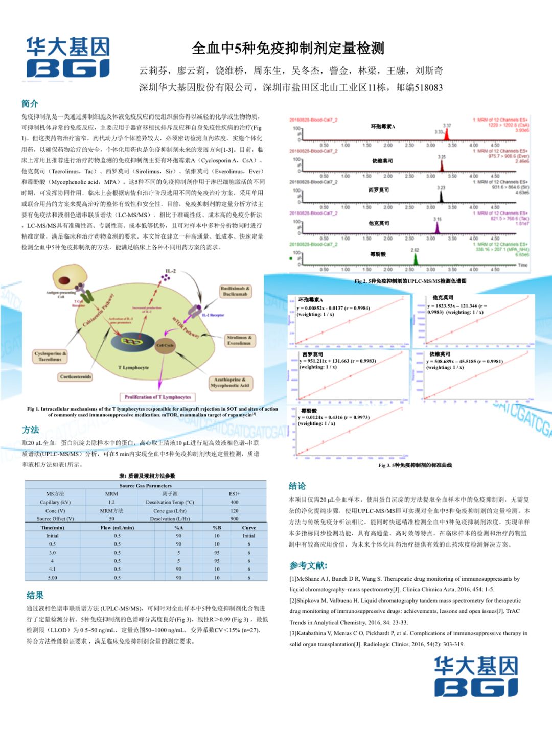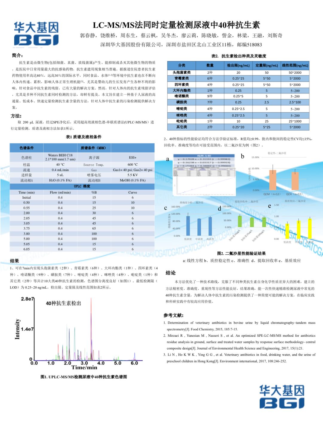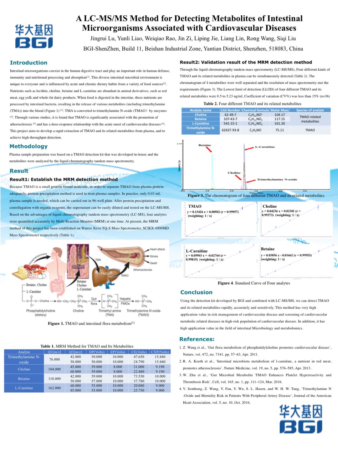 第一届中国生物物理学会代谢组学分会年会暨2019代谢组学国际研讨会,于2019年4月18日-4月21日在上海举行。此次会议由中国生物物理学会代谢组学分会主办,复旦大学人类表型组研究院承办。会议围绕代谢组学检测新技术及其在健康、疾病、植物、食品、肿瘤代谢机制方面的研究和应用等主题展开。 华大基因质谱团队将在会议期间呈现一场主题为“从疾病代谢组学探讨健康管理“的报告,与专家学者们一起,依托现有的疾病代谢组学研究方法,探讨高尿酸的预防和管理方案,并以Poster形式展出华大质谱平台的7项最新研发成果。 以下是Poster展出研发成果概述: 人体抗生素残留检测 抗生素能抑制或杀灭微生物(包括细菌、真菌、放线菌属),而它本身正是由微生物产生,在医院日常抗感染类药物当中用量最大。据报道,当前中国住院患者抗生素使用率高达80%,远超国际平均水平——30%,滥用现象相当普遍。同时食品、水体等环境中的抗生素也不断向人体内富集,影响人体正常生理机能,尤其对婴幼儿的生长发育不利。抗生素的种类繁多,然而当前在人体抗生素残留检测方面缺乏一次检测多种不同抗生素的方案。该项研究克服了不同种抗生素化学性质差异大的困难,建立了一种高通量、低成本、快速的尿液抗生素含量检测方法。该方法精密度、准确度高,重现性良好,能一次性快速精准检测尿液中常见的40种抗生素含量,为人体抗生素残留检测提供了一种简便可行的解决方案,在科研和临床实践中有较高的应用价值和较好的应用前景。 儿茶酚胺及其代谢物检测 儿茶酚胺由神经组织(包括大脑)和肾上腺产生,主要包含多巴胺、去甲肾上腺素、肾上腺素、变肾上腺素、去甲变肾上腺素、高香草酸和香草扁桃酸。这7种物质是正常生理过程中的重要信号介质,它们的含量会随身体状态变化而改变。研究表明,这7种物质的检测可以用于辅助诊断高血压、嗜铬细胞瘤和神经母细胞瘤等内分泌相关疾病。2014年,由美国内分泌学会与欧洲内分泌学会和美国临床化学协会共同制定的国际指南指出:嗜铬细胞瘤的初始生化筛查对象为尿液。基于尿液样本采集方便、成本低,且上述目标检测物更加稳定。该项研究建立了一种方法,采用1mL尿液样本即可快速精准检测尿液中儿茶酚胺及其代谢物的浓度,高通量、低成本,可作为尿液中儿茶酚胺及其代谢物快速定量检测的有效手段,有望解决由儿茶酚胺及其代谢物含量异常引发的相关疾病(如嗜铬细胞瘤、神经母细胞瘤等)的快速筛查与诊断。 132种尿液代谢物定量检测 人体尿液代谢组可检测多种与先天遗传性代谢病相关的代谢物,气相色谱-质谱联用技术测定尿液代谢物方法的建立,将有助于扩大遗传性代谢病筛查的病种,有利于进一步降低出生缺陷。该项研究基于Agilent 5977 MSD气相色谱-质谱仪,建立了对人体尿液中132种代谢物定量分析的气相色谱-质谱检测方法,并进行了临床检验方法学评价,验证结果符合临床检测要求,证明该方法可用于人体尿液代谢物的筛查检测以及多种先天性遗传代谢疾病的筛查和诊断,在科研和临床实践中有较高的应用价值和较好的应用前景。 全血中5种免疫抑制剂定量检测 免疫抑制剂是可抑制细胞及体液免疫反应,使组织损伤得以减轻的一类物质,临床主要应用于器官移植抗排斥反应和自身免疫性疾病的治疗。但这类药物治疗窗(药物有效的浓度区间)窄,在不同个体间作用差异大,必须通过密切检测血药浓度、实施个体化用药来保障药物治疗安全性和治疗效果,这是免疫抑制剂未来的发展方向。目前,临床上常用且推荐在治疗中进行药物监测的免疫抑制剂主要有5种:环孢霉素A、他克莫司、西罗莫司、依维莫司和霉酚酸,它们作用于免疫反应的不同时期,可发挥协同作用。临床上会根据病情和治疗阶段不同,采取单用或联合用药的不同方案来提高治疗的有效性和安全性。该项研究针对免疫抑制剂的临床定量监测需求建立了一种方法,仅需20 μL全血样本,通过蛋白沉淀方法提取其中的免疫抑制剂,应用UPLC-MS/MS同时快速精准检测5种免疫抑制剂浓度,可实现单样本多指标同步定量检测,具有高通量、高时效等特点,为个体化用药提供了有效的血药浓度检测方案,对临床样本检测和治疗药物监测有较高应用价值。此外,BGI具备完善的平台,可根据项目需求,提供精准定量分析的解决方案,为科研助力。 5 min内完成 15种血浆胆汁酸精准定量分析 胆汁酸是胆汁的重要成分,在脂肪代谢与多种生理病理过程中起着重要调节作用,在疾病诊断和鉴别中具有重要价值,因而受到广泛关注。人体内胆汁酸按不同结构分为两大类,一类称为游离型胆汁酸,主要包括胆酸、脱氧胆酸、鹅脱氧胆酸、石胆酸和熊脱氧胆酸;另一类称为结合型胆汁酸,是游离型胆汁酸分别与甘氨酸或牛磺酸的结合产物,共10种。目前已报道的临床胆汁酸检测方法存在前处理复杂或检测时间长等问题,难以普及应用。该项研究旨在开发一种高通量、低成本、快速定量检测血浆中15种胆汁酸的方法,实现对胆汁酸的分型检测,提升疾病诊断的精准度。通过对前处理过程进行优化,实现了前处理过程自动化,能一次处理96个样本,缩短了前处理时间, 5 min内完成基于LC-MS/MS的15种胆汁酸精准定量分析。这种方法具有高通量、低成本、快速定量的优势,对推动胆汁酸分型检测方法