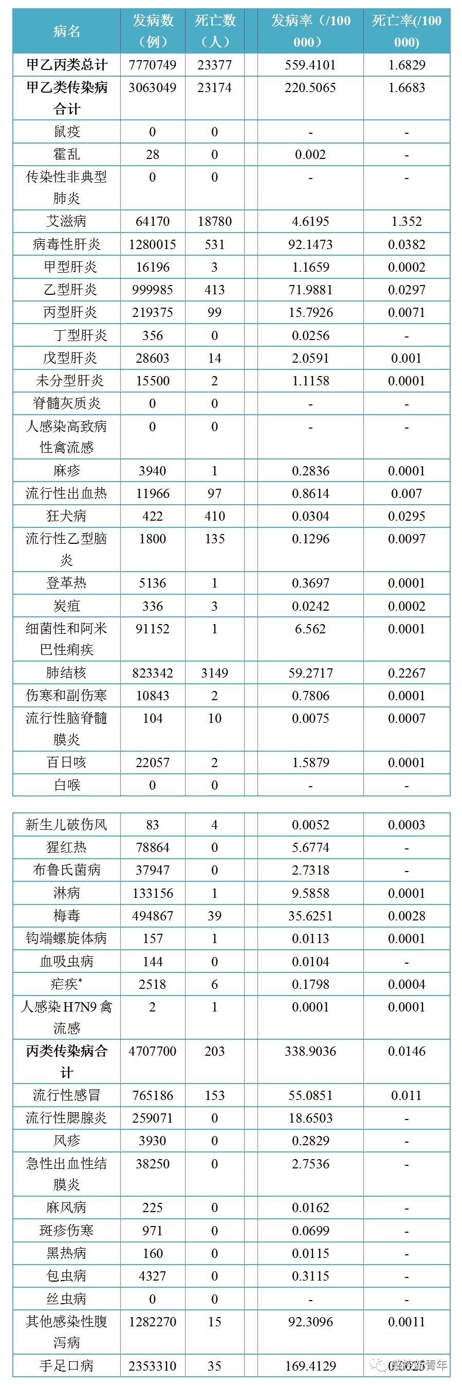 2018年全国法定传染病按类别统计:一是甲类传染病中鼠疫无发病死亡报告,霍乱报告发病28例,无死亡,报告发病率为0.0020/10万,较2017年增加14例病例。二是乙类传染病除传染性非典型肺炎、脊髓灰质炎、人感染高致病性禽流感和白喉无发病、死亡报告外,其他共报告发病3063021例,死亡23174人,报告发病率为220.51/10万,报告死亡率为1.67/10万,较2017年报告发病率下降0.70%,报告死亡率上升17.20%,其中艾滋病报告死亡病例数较2017年上升23%,主要是由于部分感染者转变为艾滋病病人进而引起其他基础性疾病导至死亡以及部分新发现的感染者和病人发现晚,未进行治疗已死亡。报告发病数居前5位的病种依次为病毒性肝炎、肺结核、梅毒、淋病、细菌性和阿米巴性痢疾,占乙类传染病报告发病总数的92.15%;报告死亡数居前5位的病种依次为艾滋病、肺结核、病毒性肝炎、狂犬病和乙型脑炎,占乙类传染病报告死亡总数的99.27%。三是丙类传染病除丝虫病无发病、死亡报告外,其他共报告发病4707700例,死亡203人,报告发病率为338.90/10万,报告死亡率为0.015/10万。报告发病数居前5位的病种依次为手足口病、其他感染性腹泻病、流行性感冒、流行性腮腺炎和急性出血性结膜炎,占丙类传染病报告发病总数的99.80%;报告死亡数的病种依次为流行性感冒、手足口病和其他感染性腹泻病,占丙类传染病报告死亡总数的100%。