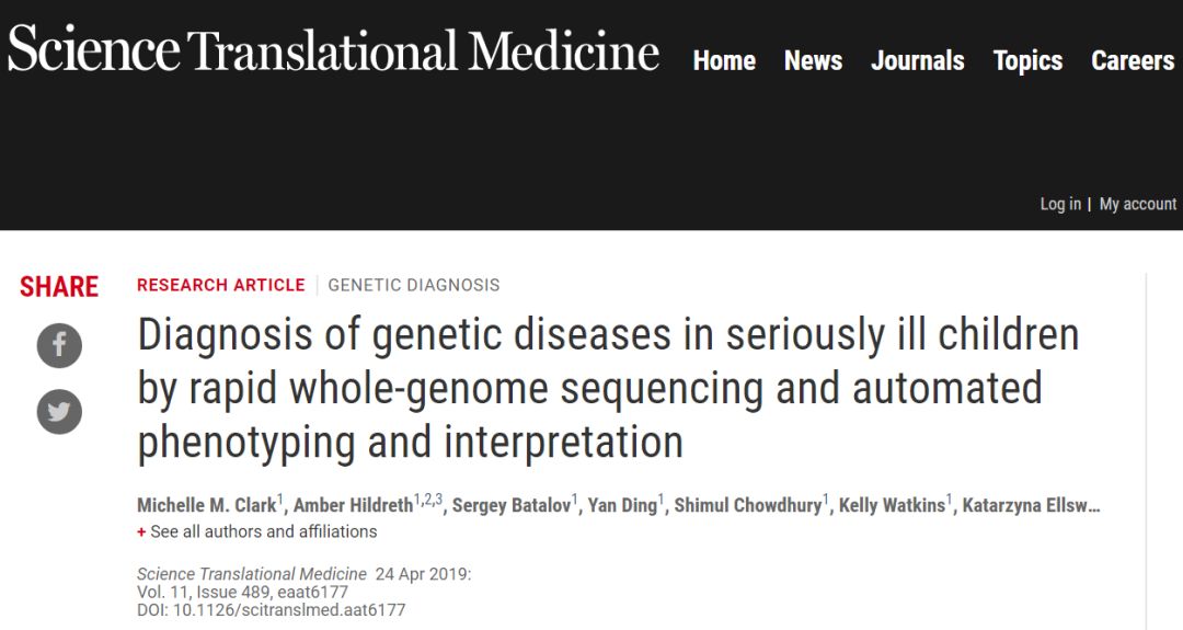 遗传病是新生儿的头号杀手,也是五岁以下儿童死亡的主要原因之一。在中国,新生儿出生缺陷的发生率约为6%,遗传病占总出生缺陷的30%。北美约有4%的新生儿患有遗传病,约15%的儿童医院住院患者患有罕见病。对于重症患者来说,时间就是生命,在治疗患有遗传病的重症儿童时,时间更是至关重要。快速的全基因组测序可以提供有针对性的治疗信息,从而有效改善重症遗传性病儿童的治疗结果,尤其是新生儿。 美国拉迪儿童基因组医学研究所(RCIGM)的工作人员素来以工作迅速闻名,2018年2月份,该研究所以平均用时19小时的全基因组测序快速诊断技术,打破了吉尼斯世界纪录。随后,该研究所建立了一套自动化分析流程,用于分析来自电子病历的数据和干血斑的基因组序列,为疑似遗传病重症儿童提供潜在的诊断方案。该工作系统可在24小时内提供检查结果,极大地减少了用户干预,提高了可用性,并且诊断时间更短。近日,该研究成果发表在Science Translational Medicine上,文章题为“Diagnosis of genetic diseases in seriously ill children by rapid whole-genome sequencing and automated phenotyping and interpretation”。 “有人称之为人工智能,我们把它叫做增强智能,” RCIGM首席执行官Stephen Kingsmore博士表示,“患者护理仍然由医生发起和结束,但借助于科技的力量,我们可以快速并准确地判断遗传疾病的根源。为重症监护医生快速地提供关键信息,有助于为重症儿童提供个性化护理。” Stephen Kingsmore博士 该自动分析流程可直接从血样中制备基因组文库,并在15.5小时内对100-NT reads进行测序,加快了基因组测序的进程。其涉及的技术包括快速全基因组测序(rWGS),该技术能从血液样本中筛查儿童全基因组中成千上万个遗传变异的情况。rWGS流程中的关键部分来自Illumina,包括利用Nextera DNA Flex文库制备,NovaSeq6000测序平台以及S1型号细胞流动池进行全基因组测序。其他技术包括Clinithink的临床自然语言处理平台CliX ENRICH,该平台能快速梳理患者的电子病历并自动提取关键表型信息,其精确度为80%,查全率(recall)为93%。同时,该系统提取的表型特征与疾病预期表型特征的匹配率要远高于人工解读。 该流程的另一个核心是由Diploid开发的MOON系统,该平台利用AI技术自动解析基因组,并对疑似致病变异进行自动过滤和筛查。利用自然语言处理医学文献进行深度表型集成,是驱动基因自动解读的关键一步。MOON可在5分钟内在全基因组450万个基因变异中筛选致病突变。此外,Alexion公司的罕见病和数据科学专业知识有助于将临床信息转换为一种可计算格式,指导变异信息的解读。 此外,基因测序数据会在研究人员的监督下输入自动分析平台。为进行比较和验证,研究团队中的临床医学遗传学家利用Fabric Genomics的AI算法来确认自动化流程的结果,该算法可将VAAST和Phevor整合到临床决策辅助软件OPAL(现改名为Fabric Enterprise)中。 利用该系统,研究人员在95名患有97种遗传病的儿童中进行了自动化分析诊断,将患者CNLP数据与匹配的所有遗传疾病预期表型特征,以及患者所有致病性基因变异结合,研究结果显示其精确度为99%,查全率(recall)为97%。在前瞻性研究中,该系统平台正确诊断了7个重症ICU婴儿中的3个,并且精确度和召回率为100%,节省了大量时间,有助于及时实施精准治疗。 “机器学习平台并不是替代人类专家,相反,这些平台增强了他们的能力。” 文章第一作者Michelle Clark表示,“通过及时告知靶向治疗方案,快速基因组测序可以改善重症遗传病儿童的治疗效果和预后。” 斯克里普斯研究所分子医学教授Eric Topol 认为:“这是RCIGM团队一项真正的开创性工作,利用AI技术快速准确的分析重病新生儿的全基因组测序数据,以此来挽救他们的生命。” 该系统的开发为促进基因测序技术成为儿童一线诊断检测手段提供了强有力的支持。诊断流程自动化的提升有助于降低WGS扩大临床应用的障碍,并减少临床诊断中数据分析和解读的耗时。虽然该流程还需要适应不同医院的工作系统,但这种自动化诊断工具可以帮助医生加快遗传病的准确诊断,有可能对患者的救护产生根本性的变化。 参考资料: 1. Diagnosis of genetic diseases in seriously ill children by rapid whole-genome sequencing and automated phenotyping and interpretation 2. Rapid, AI-Powered Genetic Disease Diagnosis for Critically Ill Infants · END · |