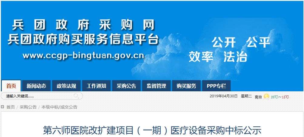 4月23日,兵团政府采购网发布《第六师医院改扩建项目(一期)医疗设备采购中标公示》。