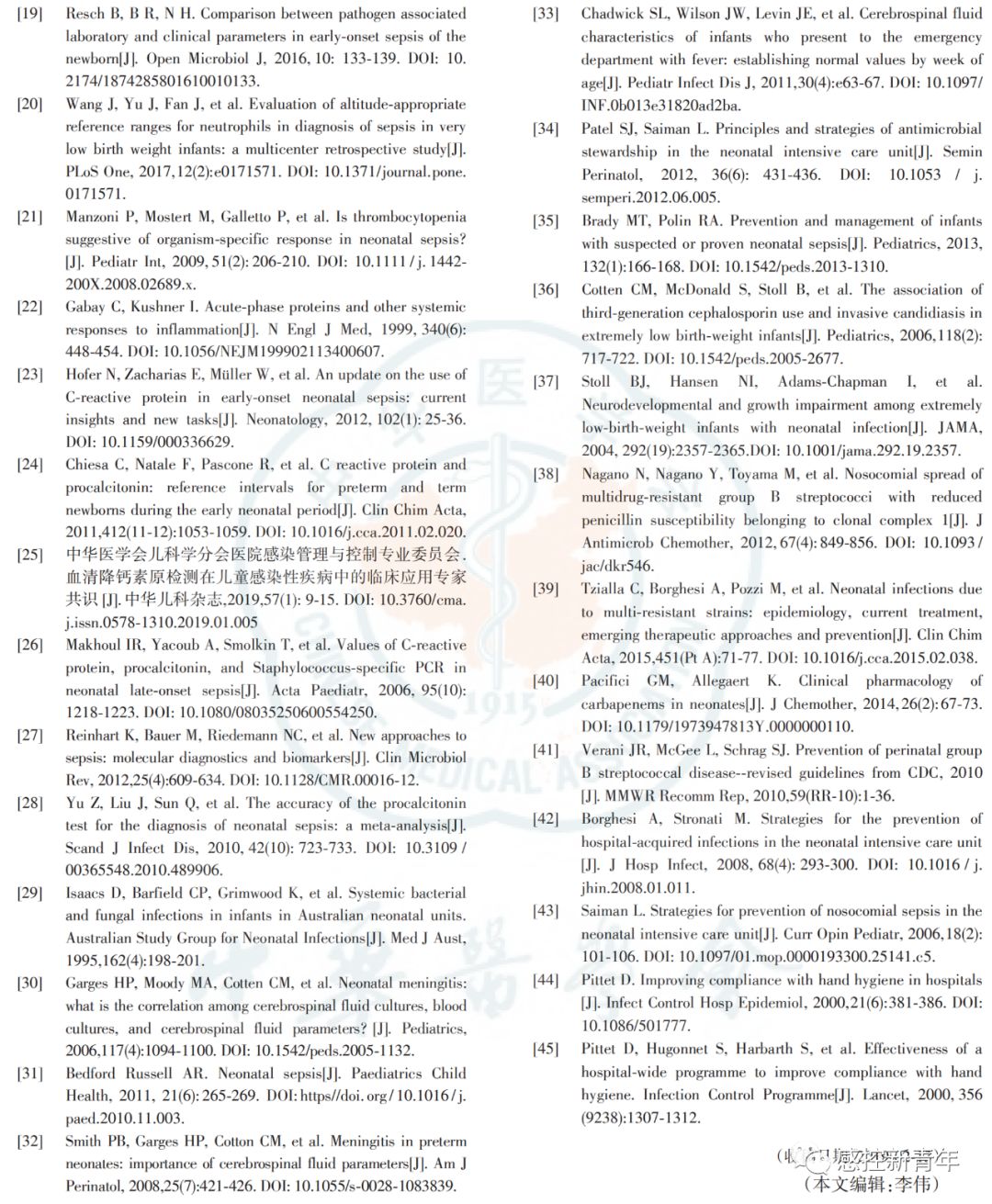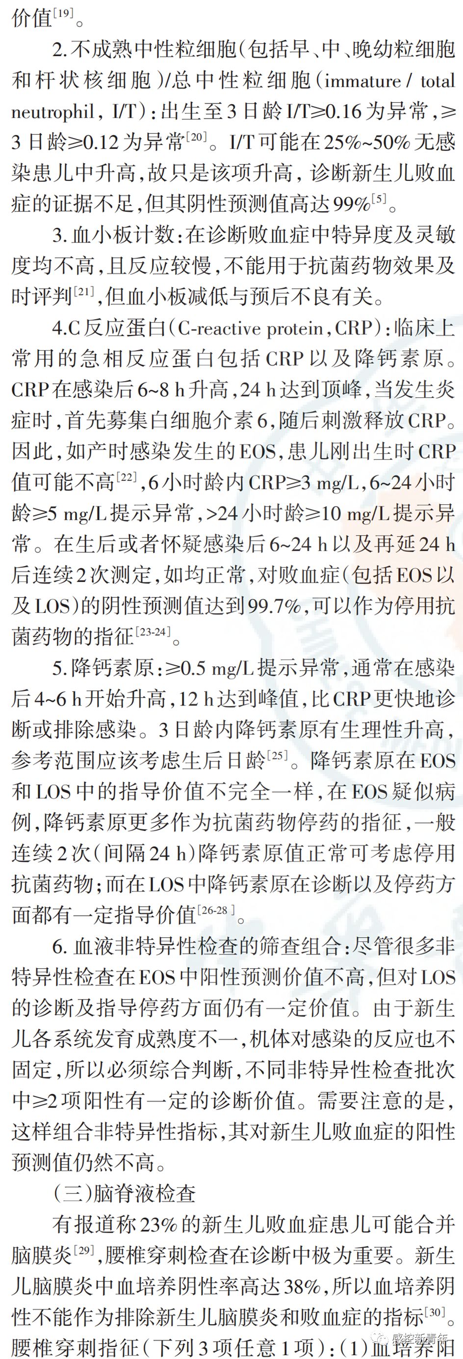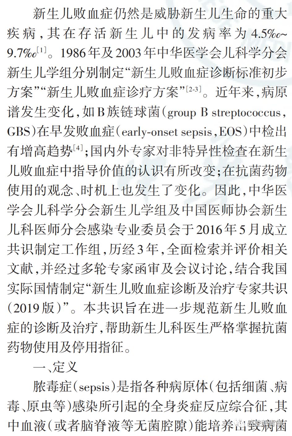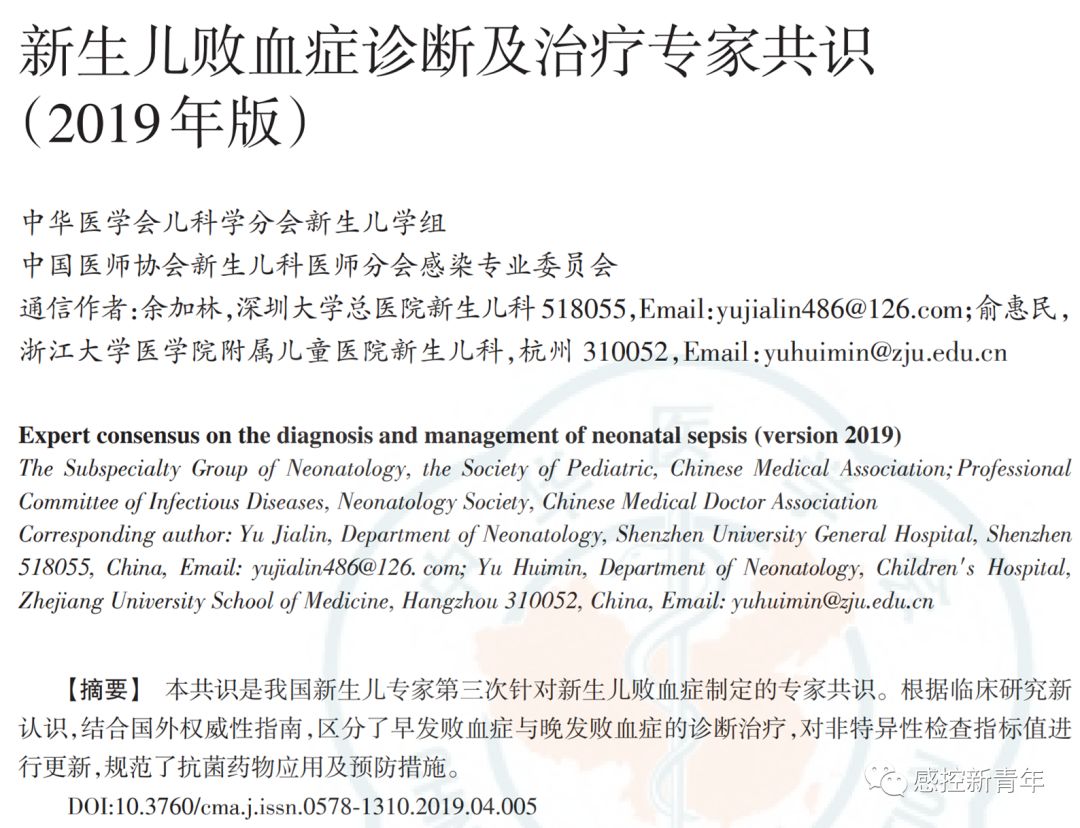 作者丨中华医学会儿科学分会新生儿学组 中国医师协会新生儿科医师分会感染专业委员会 来源丨中华儿科杂志, 2019,57(4) : 252-257. DOI丨 10.3760/cma.j.issn.0578-1310.2019.04.005 新生儿败血症诊断及治疗专家共识(2019年版) 新生儿败血症仍然是威胁新生儿生命的重大疾病,其在存活新生儿中的发病率为4.5‰~9.7‰。1986年及2003年中华医学会儿科学分会新生儿学组分别制定"新生儿败血症诊断标准初步方案""新生儿败血症诊疗方案"。近年来,病原谱发生变化,如B族链球菌(group B streptococcus,GBS)在早发败血症(early-onset sepsis,EOS)中检出有增高趋势;国内外专家对非特异性检查在新生儿败血症中指导价值的认识有所改变;在抗菌药物使用的观念、时机上也发生了变化。因此,中华医学会儿科学分会新生儿学组及中国医师协会新生儿科医师分会感染专业委员会于2016年5月成立共识制定工作组,历经3年,全面检索并评价相关文献,并经过多轮专家函审及会议讨论,结合我国实际国情制定"新生儿败血症诊断及治疗专家共识(2019版)"。本共识旨在进一步规范新生儿败血症的诊断及治疗,帮助新生儿科医生严格掌握抗菌药物使用及停用指征。 |