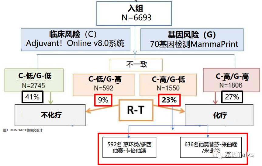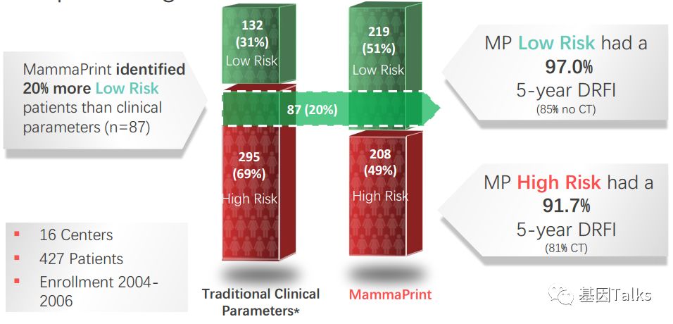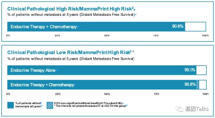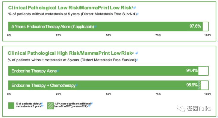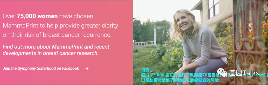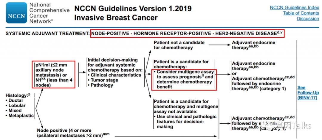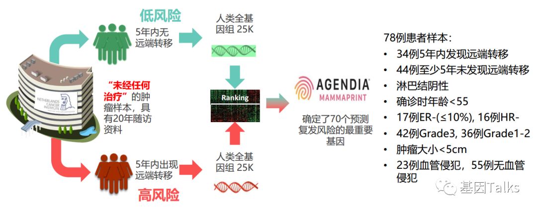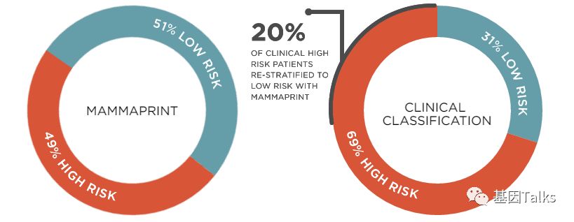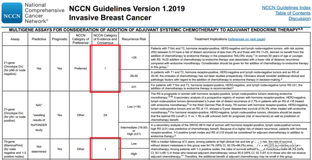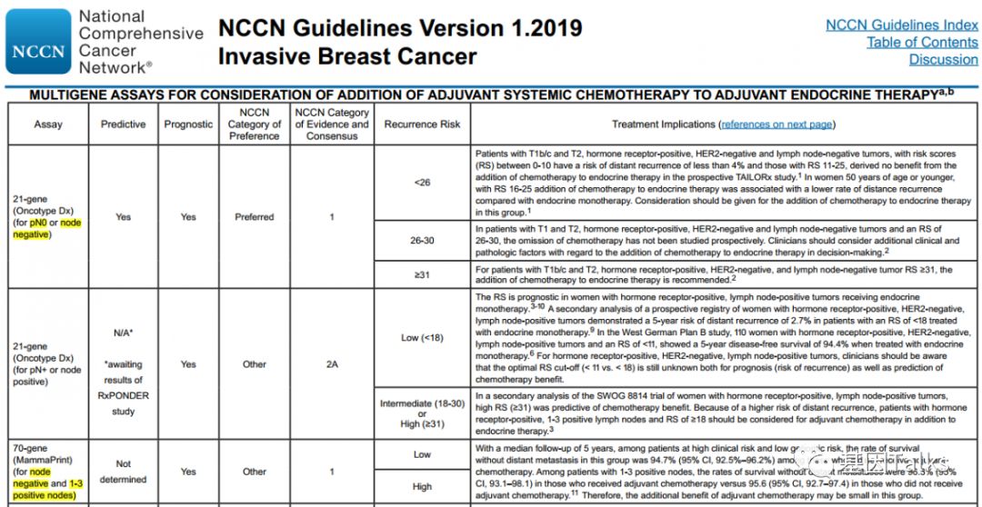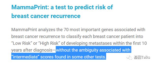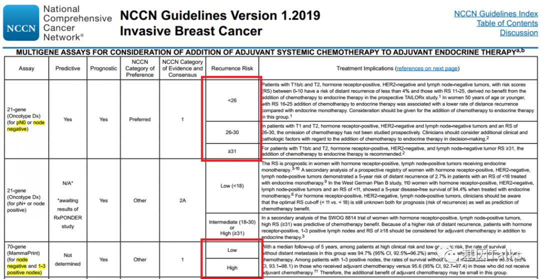 乳腺癌是一种高度异质性的肿瘤,各分子分型间发病年龄、临床特征、恶性程度及预后等方面各不相同。乳腺癌的治疗已经进入化疗联合靶向治疗的时代,但并非所有患者都应接受化疗。临床病理指标在结合多基因检测指标后,患者可以得到更精细的亚组分型治疗,避免过度的治疗。 多基因检测系统与传统的TNM分期、临床病理指标相比能够提供更准确的预后预测信息,并为选择治疗方案提供更加可靠的参考,即应接受化疗的接受化疗等有效药物进行治疗,无需化疗的可以不接受化疗,这也是肿瘤精准治疗的重要突破方向。 ▲ 乳腺癌2019.V1版NCCN 指南中乳腺癌多基因检测系统的应用 2019年最新版乳腺癌 NCCN 指南(2019.V1版)显示:证据等级为1级的多基因检测产品目前就只有两款,一款是乳腺癌21基因,一款是乳腺癌70基因。如果说乳腺癌21基因是集预测和预后双重功效于一体的多基因检测产品,那乳腺癌70基因就是重点针对预后的一款多基因检测产品。 ▲ 乳腺癌2019.V1版NCCN 指南中两款1级多基因检测产品(21&70基因) 说到乳腺癌21基因, 大多数人都比较熟, 但是, 提到乳腺癌70基因, 你知道吗? 说到乳腺癌21基因,大家可能都比较熟悉了,它不是乳腺癌用药21基因检测Panel:用NGS方法检测与乳腺癌靶向(或化疗)用药相关的21个基因。我们通常所说的乳腺癌21基因检测产品就是说的 Oncotype DX®。 ▲ Genomic Health 公司 Oncotype DX®产品 乳腺癌21基因是用RT-PCR方法检测乳腺癌肿瘤组织中21个不同基因的表达水平,进而来预测特定浸润性乳腺癌(HR+/HER2-/LN-)患者接受内分泌治疗或化疗的获益情况及10年远处复发率。(详见:NCCN指南已更新,你的乳腺癌21基因报告升级了么?) 那么, 什么是 乳腺癌70基因呢? 首先,必须明确的是,乳腺癌70基因检测,也不是一款乳腺癌用药70基因检测Panel:用NGS方法检测与乳腺癌靶向(或化疗)用药相关的70个基因。这里所说的乳腺癌70基因检测和乳腺癌21基因检测类似,都属于多基因表达谱分型检测产品。 乳腺癌70基因检测,通常是指欧洲 Agendia 公司 的 MammaPrint® ,它是基于大量患者随访,开发出来的70个基因检测产品。MammaPrint®分别于2004年和2007年获得CE认证及FDA 510(K)批准(用于医疗设备)。2019年4月,CSCO乳腺癌诊疗指南新增了多基因检测(MammaPrint 70基因)的重要作用。 ▲ Agendia 公司 的 MammaPrint®产品 MammaPrint®是使用cDNA微阵列技术来检测乳腺癌肿瘤组织中一组特异基因的表达,对预测预后、复发、转移乃至指导治疗提供信息,最终目的是为患者的个体化治疗提供帮助。(现在也可通过NGS RNAseq进行检测) 这70个基因是从25000个候选基因(人类全基因组)中通过无偏差随机森林算法筛选出来,并且与细胞增殖、侵袭、转移、血管新生等7个肿瘤转移的通路相关,随即组成了MammaPrint®检测产品。 ▲ MammaPrint®产品的发展历程 ▲ MammaPrint®产品所覆盖的70个基因 MammaPrint®可以更准确地预测乳腺癌复发的风险,包括部分按临床标准判断属于高风险的患者,这部分患者是不需要接受不必要化疗的。Agendia的研究数据显示,常规临床判断高风险的人群占69%,使用了MammaPrint®检测之后,高风险的人群由69%降低至49%,这其中的20%患者就无需接受不必要的化疗,避免了过度的治疗及化疗带来的相应毒性。 ▲ MammaPrint®缩小了有效需要化疗的患者的范围 乳腺癌70基因的检测用于评估早期浸润性乳腺癌患者(ER/PR+、HER2-、LN1-3个转移)5年和10年的远处复发风险,并将患者复发风险划分为高风险或低风险,从而判断患者是否需要接受化疗。 2018年乳腺癌 NCCN V2版指南将乳腺癌70基因检测纳入并将证据等级列为1级进行推荐,主要的参考就是2016年《新英格兰医学杂志》发表的一项大型前瞻性、随机、多中心试验:MINDACT试验。 在MINDACT试验患者中,如果仅根据临床特征(肿瘤大小和结节状态)决定是否给予辅助化疗,50%的患者接受辅助化疗(高临床风险患者共有:1550例低基因风险+1806例高基因风险=3356例),在所有3356例高临床风险患者中,采用70基因检测指导化疗,将减少46.2%(n=1550)的化疗使用率。 ▲ MINDACT试验的研究设计 同时,需要注意的是,本研究也显示出:在临床低风险且基因高风险患者中,如果以基因组风险为基础指导治疗,不管是否接受化疗,最后的生存曲线相差也不大,因为这些患者没有受益于辅助化疗。简单点说,就是临床风险低时,选择高基因风险指导化疗,并不能提供临床获益。 根据NCCN指南,乳腺癌70基因检测的适用人群为:ER/PR+,HER2-,淋巴结阴性或1-3淋巴结阳性的乳腺癌患者。 ▲ 乳腺癌70基因与21基因适用人群特点的差异 通过NCCN指南,我们可以发现:乳腺癌70基因检测是目前唯一作为1级推荐指导1-3个淋巴结阳性早期乳腺癌患者治疗决策的基因组检测。同时,我们也可以发现,乳腺癌21基因对于淋巴结阳性的乳腺癌患者,它的证据等级是2A(可能原因就是乳腺癌21基因的研究人群多数都是淋巴结阴性的患者)。对于淋巴结阴性乳腺癌患者,它们都是1类证据。 乳腺癌70基因检测的结果会将直接告诉我们患者复发风险划是高风险还是低风险;同时还会结合临床风险评估(高/低风险)与70基因风险风险评估(高/低风险)进行结合判断患者是否需要接受化疗。 一、复发风险评估方面: 乳腺癌70基因的检测结果可明确的分为高风险和低风险。风险值范围是:-1.000~1.000。 高风险是负值(-),范围是:-1.000~0.000;如果不接受任何辅助治疗(内分