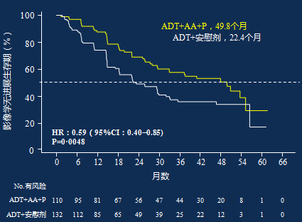 在低肿瘤负荷组中,阿比特龙同样可以显著延长患者影像学PFS达49.8个月(IQR 29.6-55.2),对照组仅22.4个月(IQR 18.2-29.8);降低影像学进展风险达41%(95%CI 0.40-0.85,p=0.0048)(图4)