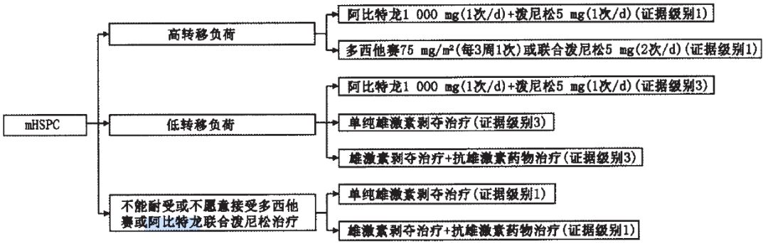 在CACA共识的mHSPC药物治疗部分,第一条推荐就是关于阿比特龙的:对于mHSPC患者,推荐雄激素剥夺治疗(ADT)联合阿比特龙1000mg(1次/d)联合泼尼松5mg(1次/d)治疗(证据级别1)另外,对于低转移负荷患者,推荐ADT联合阿比特龙1000 mg(1次/d)联合泼尼松5mg(1次/d)治疗,或单纯ADT,或ADT联合抗雄激素类药物(CAB)治疗(证据级别3)(图1)