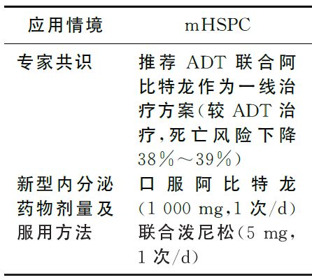 专家共识推荐:针对mHSPC患者,尤其是高危患者(Gleason评分8~10,3处以上骨转移病灶或内脏转移等3项危险因素至少满足2项者),ADT联合阿比特龙应作为标准一线治疗方案。推荐剂量为1000mg口服,1次/d,与泼尼松5mg口服1次/d联用(表1)