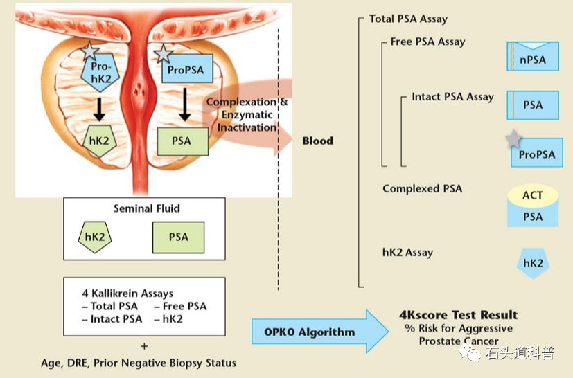 前列腺癌是目前男性面临的最常见癌症之一,是我国第六大恶性癌。前列腺特异性抗原(prostate specific antigen 或者 PSA)是一种由前列腺上皮细胞分泌产生的一种丝氨酸蛋白酶,是一种糖蛋白。PSA及其衍生物是目前早期筛查前列腺癌最常用的生物标志物,目前已经发展出了PHI和4KScore等结合多指标联合检测结果的综合评判标准。但因PSA特异性低带来的假阳性给患者带来了大量的经济和生理负担,人们仍然在寻找更好的前列腺癌生物标志物以更好的实现前列腺癌的早期诊断。本文主要介绍目前一些研究较火特别是具有产业前景的前列腺癌诊断指标,其中不乏已经被FDA批准。关于前列腺癌、PSA及其检测方法、国外主要免疫平台和Claros微流控PSA检测系统的介绍可在公众号菜单查询。 蛋白类标志物 人激肽释放酶2(hK2) 人激肽释放酶2(hK2),是一种丝氨酸蛋白酶,能够催化ProPSA生成PSA。在前列腺腺细胞中,hK2能够在亮氨酸5和丝氨酸6间切割,余下两个多余的残基成为[-2]pPSA,或者p2PSA,这也是贝克曼PHI的生物学机理。hK2会在前列腺组织中高度表达以促进前列腺癌的生长,因此,可以通过测试hK2来进行前列腺癌的诊断。OPKP提出的4Kscore法,通过测定fPSA、tPSA、iPSA、hK2四种标志物,结合年龄、直肠指检(DRE)等结果,综合判断病人得前列腺癌的风险。4Kscore测试暂时还未经FDA批准,但通过了CAP认证、CLIA认证及LDT监管。 前列腺酸性磷酸酶(PAP) 前列腺酸性磷酸酶(PAP)是一种前列腺外分泌物中能水解磷酸酯的糖蛋白。在前列腺癌时,血清中PAP水平明显升高,且其升高程度与前列腺癌的病情基本呈平行关系。PAP对前列腺癌的早期诊断意义不大,但对监测前列腺癌的治疗效果、有无复发、转移及预后则有重要意义。国内新产业和苏州长光华医有相关试剂盒获得FDA认证。国外有西门子、日本东曹公司等在FDA有认证。值得题的是,苏州长光华医是我查到的前列腺癌诊断标志物最多的国内企业,显示了其在化学发光上具有较强的研发实力。 苏州长光华医关于前列腺癌的产品目录截图 ProMark ProMark是Metamark公司推出的一种基于组织活检后前列腺癌测试。其原理是使用全自动免疫荧光成像平台检测多种蛋白质生物标记物。这些标志物及其功能如下图所示,感兴趣的可以搜索查询Metamark公司。 早期前列腺抗原(EPCA)及早期前列腺抗原-2(EPCA-2) 早期前列腺抗原(EPCA)和早期前列腺抗原-2(EPCA-2)在前列腺癌中高表达但未在其它正常组织或癌症类型中表达的核结构蛋白。核基质负责维持细胞核的核形状,功能和组织。、EPCA-2检测对前列腺癌的特异性优于PSA。它在区分局部和外部荚膜疾病方面也非常准确。目前EPCA和EPCA-2的研究数据量还太小,因此需要进一步评估。 其它标志物 前列腺特异性肽(PAP)、前列腺特异性膜抗原(PSMA)和蛋白质组学测试 总结 目前前列腺癌的蛋白标志物仍然以PSA及其衍生物为主,尽管其它标志物在特异性或者灵敏度有一定优势,但并不能完全替代PSA。前列腺癌没有特别明确的癌变机理,且癌症的异质性严重,导至单一标志物很难完全满足体外诊断对于灵敏度和特异性的要求。目前产业和科研的重点都在于如何使用联合检测进行综合判断,以提高其检测的灵敏度和特异性。 核酸类标志物 前列腺癌抗原3(PCA3) 前列腺癌抗原3(PCA3或DD3)是前列腺特异性基因,其具有高度的特异性且与前列腺的其它疾病和前列腺体积无关。与血清PSA相比,PCA3具有较低的敏感性,但具有较高的特异性和较好的阳性和阴性预测值。PCA3是目前最有可能替代PSA进行前列腺癌早期诊断的生物标志物。早在2002年,人们就开始用real time RT-PCR进行PCA3 mRNA的检测。Gen-Probe开发了第一个测试PCA3的试剂盒Progensa PCA3,其使用的方法是之前有介绍的Transcription-Mediated Amplification (TMA),具体原理如下图所示。Progensa PCA3通过测试PCA3和PSA mRNA分子的浓度,并计算直肠检查(DRE)后尿样中PCA3 mRNA分子与PSA mRNA分子(它们称为PCA3 Score)的比率。Progensa PCA3于2012年获得FDA批准,先已被世界很多国家所采用。Gen-Probe于2012年以37.2亿美元被Hologic收购。关于PCA3有很多综述进行报道,感兴趣的可以搜索查询。也可在后台回复“Progensa PCA3 Assay”下载Hologic出的手册。我暂时没有查到国内有企业进行相关技术的研发,有消息的可以私信,感谢!! TMPRSS2-ERG TMPRSS2-ERG基因融合是前列腺癌的主要分子亚型。TMPRSS2是雄激素调节的跨膜丝氨酸蛋白酶,其在正常前列腺上皮中表达,在前列腺癌组织中的表达增加。尽管TMPRSS2-ERG的假阳性很低,但其在很多种癌症中都存在高表达,因此需要联合其它指标进行检测来提高其特异性。目前研究较多的是结合TMPRSS2-ERG和PCA3的联合检测来进行早期前列腺癌诊断。北京金菩嘉医疗科技有限公司是国内唯一一家取得FDA认证的TMPRSS2-ERG基因诊断试剂盒,该产品用于检测疑似为前列腺癌患者的前列腺组织石蜡包埋切片样本中的ERG、TMPRSS2、ETV1、ETV4基因异常。其使用的技术原理是荧光原位杂交法,即FISH。未来或许可以尝试在DRE检测后的尿液样本中进行TMPRSS2和PCA3的联合检测。 其它核酸标志物 AMACR mRNA、GSTP1、DNA 甲基化和基因组分析。 总结: 核酸类标志物通常比蛋白类标志物具有更好的特异性,但其样本获取难、技术难度也更高。通常为了测量的准确,都需要在直肠指检DRE之后取样、或者直接进行活检取样。这样会面临两个问题:样本的稳定性和取样时