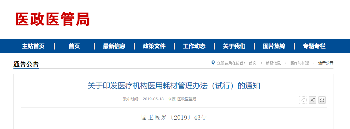 第一章 总则 第一条 为加强医疗机构医用耗材管理,促进医用耗材合理使用,保障公众身体健康,根据《执业医师法》《医疗机构管理条例》《医疗器械监督管理条例》等有关法律法规规定,制定本办法。 第二条 本办法所称医用耗材,是指经药品监督管理部门批准的使用次数有限的消耗性医疗器械,包括一次性及可重复使用医用耗材。 本办法所称医用耗材管理,是指医疗机构以病人为中心,以医学科学为基础,对医用耗材的采购、储存、使用、追溯、监测、评价、监督等全过程进行有效组织实施与管理,以促进临床科学、合理使用医用耗材的专业技术服务和相关的医用耗材管理工作,是医疗管理工作的重要组成部分。 第三条 国家卫生健康委、国家中医药局负责全国医疗机构医用耗材管理工作的监督管理。 县级以上地方卫生健康行政部门、中医药主管部门负责本行政区域内医疗机构医用耗材管理工作的监督管理。 第四条 本办法适用于二级以上医院医用耗材管理,其他医疗机构可参照执行。其中,非公立医疗机构的医用耗材遴选、采购工作可参照本办法进行。 第五条 医疗机构应当指定具体部门作为医用耗材管理部门,负责医用耗材的遴选、采购、验收、存储、发放等日常管理工作;指定医务管理部门,负责医用耗材的临床使用、监测、评价等专业技术服务日常管理工作。 第六条 医疗机构从事医用耗材管理相关工作的人员,应当具备与管理工作相适应的专业学历、技术职称或者经过相关技术培训。 医疗机构直接接触医用耗材的人员,应当每年进行健康检查。传染病病人、病原携带者和疑似传染病病人,在治愈前或者在排除传染病嫌疑前,不得从事直接接触医用耗材的工作。