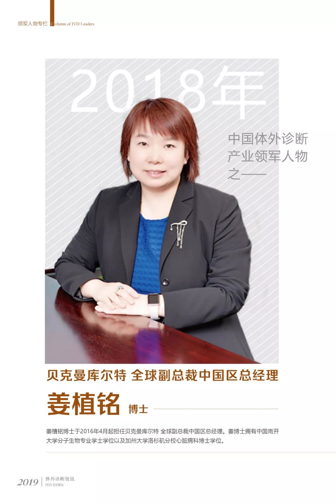 姜博士自2001年加入贝克曼库尔特美国总部,她的职业生涯中有18个年头与贝克曼库尔特相伴。姜博士在贝克曼库尔特美国总部的全球产品和市场部工作了六年,在之后的十二年里,她担任了亚太和中国各个商业领导角色,例如亚太区市场部总监、和中国以外区域的商业营运总监,并自2016年起担任贝克曼库尔特全球副总裁中国区总经理。现任中国医学装备协会检验医学分会副主任委员;全国卫生产业企业管理协会实验医学分会副主任委员;中国医学和检验整合联盟副主任委员;IVD及精准医疗产业与投资联盟副理事长。