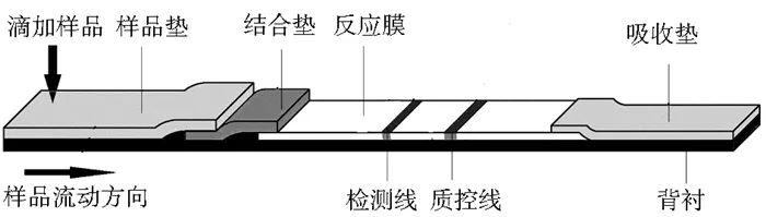试纸条是目前应用很广的快速检测平台。广泛应用于孕检、HIV等的快速诊断。其示意图如下所示:
