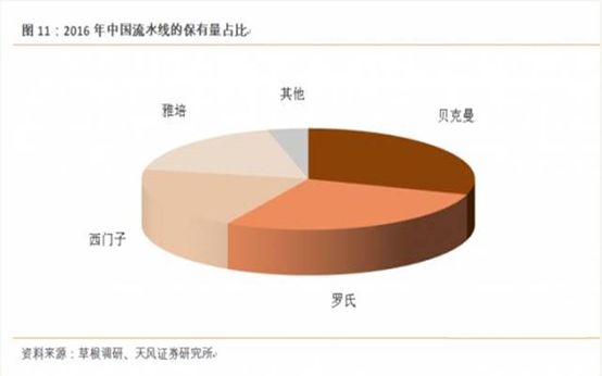 2012年后,国内流水线的装机量增长明显,每年复合增长率在100%以上,截止到2016年底流水线市场保有量达1,200条,2016年全年200余条流水线完成装机,2017年300余条流水线完成装机。但是就目前来看,国内已完成装机的流水线主要为进口品牌,其中贝克曼和罗氏装机量平分秋色,合计占总量的50%以上;雅培和西门子的装机量也在伯仲之间,合计总量至少也在30%以上。
