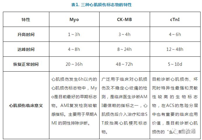 心肌损伤标志物定义:心肌损伤发病后,血中出现增高并持续数天、对心肌损伤的敏感性和特异性都高的标志物。 理想标志物的特性: 1、时间限定性;2、比例特异性;3、敏感被测性;4、分级相关性。 近年来肌酸激酶同工酶MB(CK-MB)、心肌肌钙蛋白I (cTnI)、肌红蛋白(Myo)三项指标联合检测的产品越来越多,并逐渐被临床所接受,这三项的组合多被称为“心梗三项”。 肌酸激酶同工酶MB(CK-MB) CK-MB属于传统的实验室“心肌酶谱”项目,在20世纪70年代被认为是诊断心肌梗塞AMI的“金标准”,但是其检测的是酶的活性(单位U/L),酶学检测的特异性较差,容易受到CK-BB、CK-MM等亚基的干扰,使结果偏高出现假阳性。 在第三版“心肌梗死全球定义”中建议,CK-MB应作为心肌肌钙蛋白的替代,当不能检测心肌肌钙蛋白时使用CK-MB。有些CK-MB正常但心肌肌钙蛋白已升高的患者心脏事件的风险较高。所以CK-MB联合cTn检测对临床有更好的指导。 当心肌损伤时,CK-MB立刻被释放入血液循环,在心肌损伤后3~4h开始升高,48~72小时降至正常范围。 心肌肌钙蛋白I (cTnI) 肌钙蛋白是心脏横纹肌收缩中起主要调节作用的蛋白质。有三个亚基:cTnT、cTnI和cTnC。 由于骨骼肌与心肌中的cTnC是相同的,特异性差,通常选取cTn I 和cTnT检测来诊断心肌损伤,二者的意义是相同的。由于心肌肌钙蛋白cTnI在组成上有着独特的氨基酸序列(N-端比横纹肌多31个氨基酸),骨骼肌、肝、肾等肌细胞损伤破坏不影响其测定结果的判断,因此肌钙蛋白cTnI具有良好的特异性。 健康人血内不含或含极低量的cTnI,当心肌缺血缺氧,发生变性坏死,细胞膜破损,cTnI释放,出现在外周血中。在发病后4~6h 外周血中cTnI出现,12~48小时达到高峰。在严重心肌梗塞AMI出现后,血浆cTnI保持高水平,cTnI升高持续4~10天,有很长的诊断窗口期。 心肌肌钙蛋白是目前诊断心肌损伤或坏死特异性最强和灵敏度较高的生物标志物,是目前诊断AMI最好的确定标志物。正逐步取代CK-MB成为AMI的诊断“金标准”。 肌红蛋白(Myo) 肌红蛋白存在于心肌和骨骼肌中,健康人血中含量极低。由于肌红蛋白相对分子量小,且存在于胞质内,故在肌肉损伤时出现较早。 肌红蛋白是目前公认的较好的早期心肌损伤标志物,在发病1~3h即可出现异常增高。 由于肌红蛋白Myo还在大量存在于骨骼肌中,其对心肌损伤诊断的特异性不高,但心肌梗死后会迅速地从坏死的心肌中释放出来,具有高度的敏感性。Myo阴性特别有助于排除 AMI 的诊断。由于肌红蛋白Myo在血中半衰期短,所以又有助于观察心肌梗塞AMI 病程中有无再梗死发生以及梗死有无扩展。 心肌梗塞AMI发生后,三大心肌标志物出现升高的时间早晚顺序: 肌红蛋白(Myo)最先出现升高(1~3h内) 肌酸激酶同工酶MB(CK-MB)略后升高(3~4h内) 心肌肌钙蛋白I (cTnI)出现升高较晚(4~6h内) “心梗三项”是目前临床上比较认可的心肌损伤标志物联合检测项目,大量临床文献报道使用三项联合来进行心肌损伤的诊断,对于诊断心肌梗死、评价溶栓治疗的效果、评价再栓塞与栓塞的范围及危险程度都具有重要的意义。 |