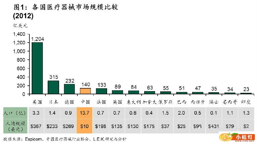 根据统计,2012年中国医疗器械市场规模达到了将近140亿美元,是继美国、日本、德国之后全球第四大市场(图1)。但其人均医疗器械消费支出仅有10美元,远落后于发达国家的水准。