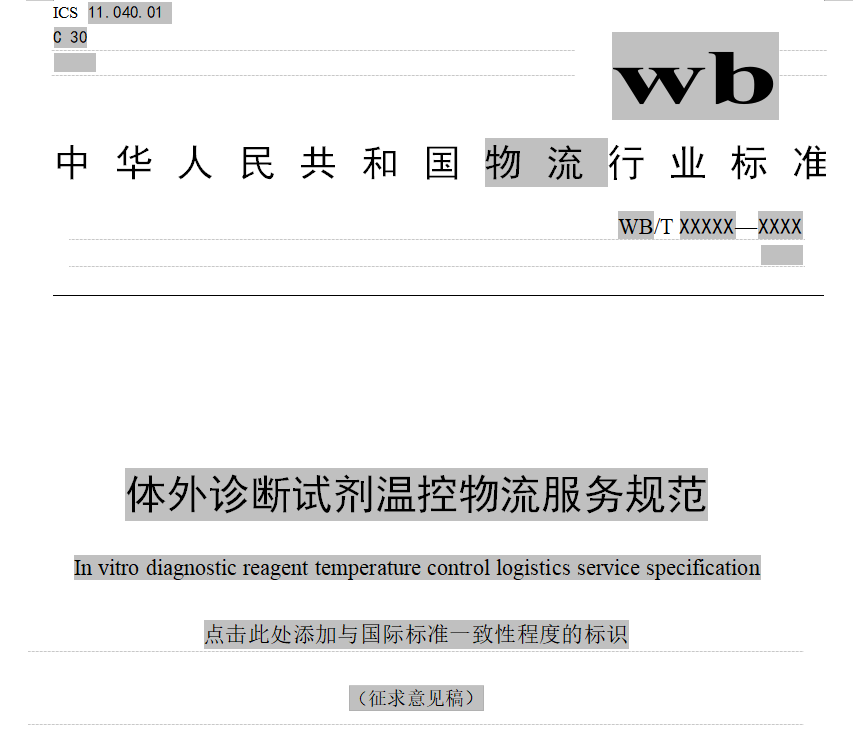由中国物流与采购联合会提出、全国物流标准化技术委员会归口的《体外诊断试剂温控物流服务规范》行业标准经起草单位调研、起草、研讨和修改完善后,现已形成征求意见稿。