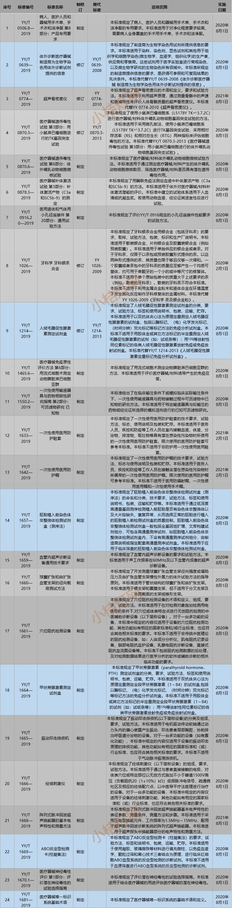 YY/T 0506.8—2019《病人、医护人员和器械用手术单、手术衣和洁净服 第8部分:产品专用要求》等24项医疗器械行业标准已经审定通过,现予公布。标准编号、名称、适用范围和实施日期等内容见附件。