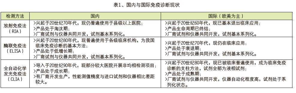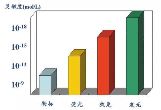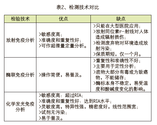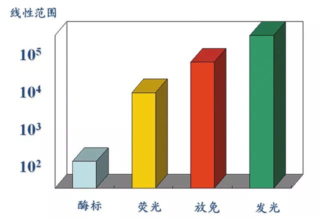 众所周知,国内IVD市场对免疫类检测需求量日益增大,各类免疫检测类产品层出不穷,化学发光作为一种检测结果较为准确的方法学,已逐渐替代ELISA免疫检测。化学发光免疫分析法(CLIA)是近三十年来迅速发展起来的非放射性免疫分析方法,是继酶免技术(EIA)、放射免疫技术(RIA)和荧光免疫技术(FIA)之后发展起来的一种超高灵敏度的微量测定技术。目前临床免疫检测所用技术主要有三类:放射免疫分析、酶联免疫分析和化学发光免疫分析。其现状、优缺点、灵敏度和线性范围的对比情况,如表1、表2、图1、图2所示。