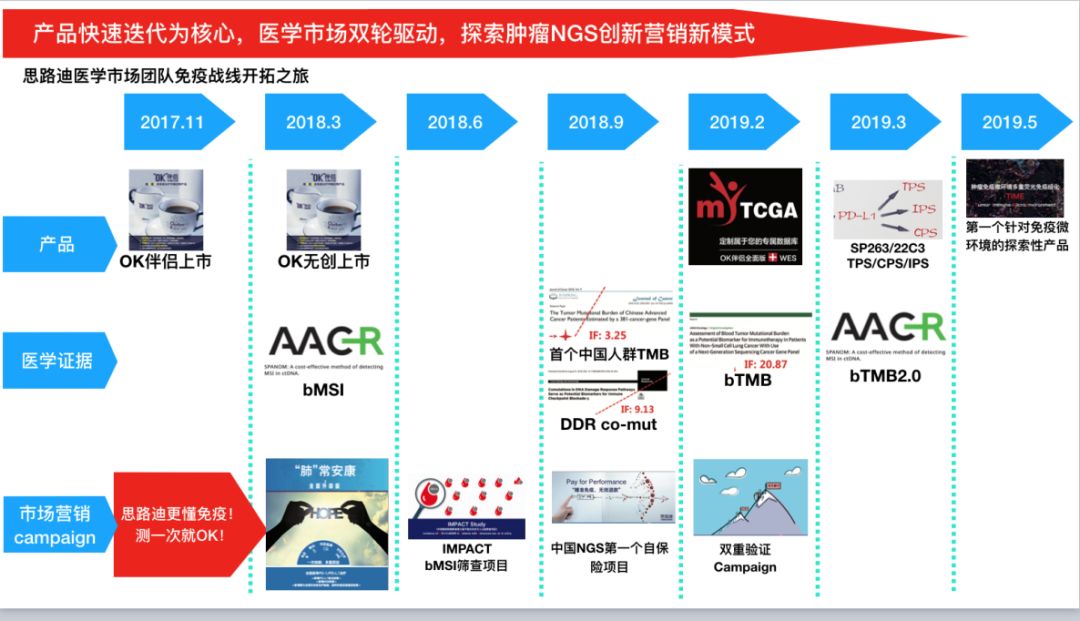 2017年11月初,思路迪推出中国首个免疫治疗辅助诊断产品“OK伴侣” 。该产品上市后20天销量突破100万,其后一路高歌猛进,截止到2019年5月,已经服务了超过10000名患者,销售额超过2个亿,成为中国NGS肿瘤领域最成功的品牌之一。每一个成功的产品背后都有一套成功的方法论,为此,测序中国特邀思路迪高级市场总监白跃宗、高级医学总监蔡尚立和创始人兼董事长熊磊博士,对这款产品成功背后的营销方法论作深入剖析,以供同行之间参考、学习和借鉴,希望与同道一起推动整个行业健康有序发展。 以下部分来自与白跃宗、蔡尚立及熊磊三人的对话整理。 “OK伴侣”作为首个为免疫治疗量身定制的NGS产品,在商业成功之外,也促进了一系列行业标准。比如首创了将PD-L1免疫组化结果与NGS结果整合到一份报告上;首创使用公司自有数据库对TMB做分瘤种排序并按照四分位来划分cut-off值;首创用概率密度图和“水槽图”来视觉化呈现TMB和MSI的结果;首创按照“正向”和“负向”来分类展示基因变异对于免疫疗效的影响。这些做法后来大都被其他同行所借鉴,使这些基于客户认知习惯和行为偏好的洞察与创新促成了这个领域的标准。 好的结果来自正确的策略和有效的方法论。我们的方法论精炼成一句话,就是“一个中心,两个基本点”。一个中心是以产品快速迭代为中心;两个基本点之一是医学团队持续生产证据累积处方势能,另一个基本点是营销团队通过创新的市场项目和活动将势能快速高效地转化为临床的处方动能。三者环环相扣,密不可分。为了更好地理解这一方法论,我们可以打个比方: 假设产品是一块“大石头”,医学团队需要通过持续的投入来开发临床证据,从而将石头推动到高处形成“势能”,医学证据越多、越强,石头就推得越高,势能就越大;而市场营销团队需要设计创新的营销战略来扫除石头滚下山坡的障碍(消除客户的处方顾虑),并强化推动石头下山的力量(强调产品优势的多渠道市场项目和活动),最高效地将势能转化为动能,使得石头滚下去的气势披荆斩棘,声势浩大,一往无前,也将客户的观念和行为快速改变,处方量持续增加。