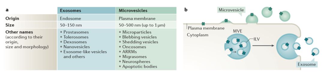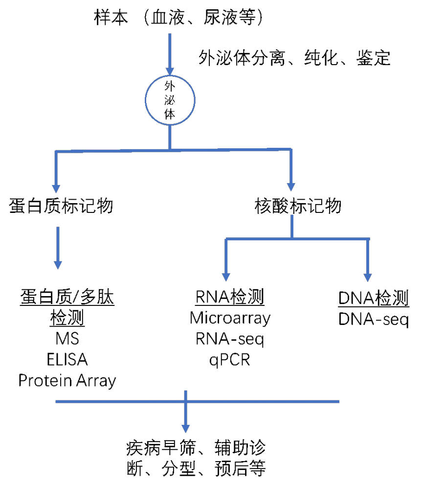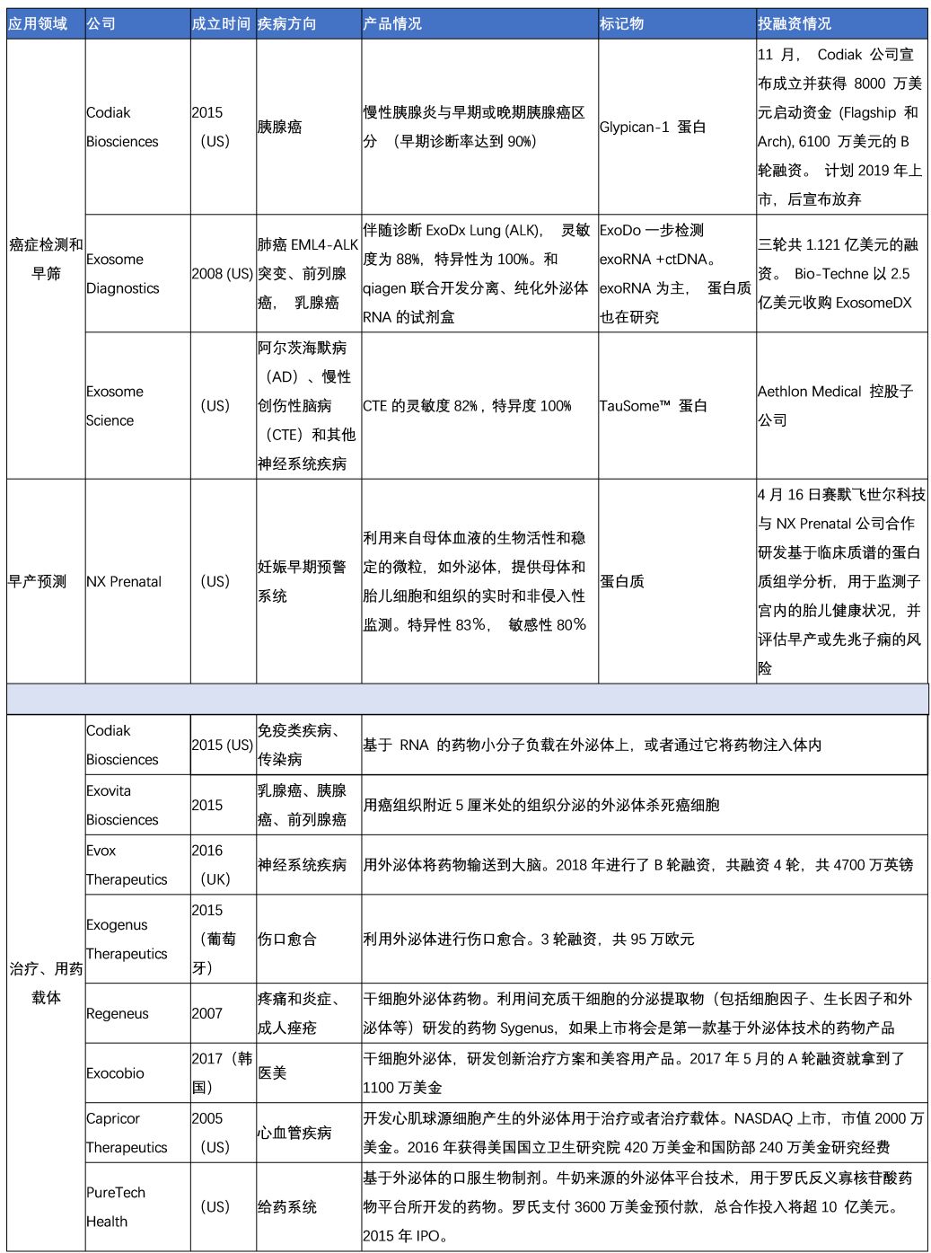本文作者:MING 早在1960年后期,Bonucci和Anderson的研究团队在观察软骨细胞时,首次发现细胞膜会分泌出直径约100nm的具有双分子膜结构的小泡。直到1980年这种小泡的产生机制及在生物体的生理功能才进一步被研究,并创造了外泌体一词。2013年的诺贝尔生理、医学奖颁给了美国科学家James E. Rothman,Randy W.Schekman和德国科学家Thomas C. Sudhof,以表彰他们发现细胞内部囊泡的运输调控机制。至此,外泌体的研究及临床应用被推向了一个新的高度。 细胞释放的膜囊泡分为外泌体(exosomes)与微囊泡(microvesicles)两种, 区别主要在其形成的机制。外泌体是细胞内的内溶酶体微粒内陷形成的多囊泡体,经多囊泡体外膜与细胞膜融合后释放到胞外的膜囊泡,而微囊泡则是细胞出芽与细胞膜融合后直接脱落形成的囊泡(图1)。另外,外泌体大小均一,直径在50~150 nm,尺寸大小取决于起源部位以及细胞中的脂质双层结构;而微囊泡大小不一,直径在50 ~1000 nm之间不等。虽然存在不同,但是微囊泡和外泌体外观相似,尺寸重合,同时包含类似物质,比较难区别,因此在科研和临床中,有时候将两者视为一体。 图1. 外泌体与微囊泡的特点与区别1 外泌体包含了丰富的信息,负责细胞间的物质运输、交流以及细胞调控 由于双膜结构的保护,外泌体包含了丰富的信息,包括蛋白质、DNA、信使 RNA、一些非编码RNA以及脂类等,能够提供多组学的信息(图2)。随着蛋白质组学研究和基因测序技术的快速发展,相对成熟的外泌体数据库得以积累,如EVpedia, Vesiclepedia, exoRBase等。其中,Exocarta数据库记录了外泌体中鉴定的 9769 种蛋白质, 1116种脂, 3408种 mRNAs,以及2838 种miRNAs。这些数据库在外泌体的识别分类以及对其里面生物标记物的筛选上起着非常大的作用。 图2. 外泌体的膜蛋白及包含物1 外泌体在进入外环境后,可通过自分泌或旁分泌途径被细胞吸收,也可经循环系统被远距离靶组织或靶器官吸收,因此作为细胞信号交流的媒介,负责细胞间的物质运输和信息传递,直接或间接调控接受细胞的功能和表型。同时,外泌体具有异质性,且与母细胞高度相关,可反映母细胞的状态, 与母细胞的生理功能或病理改变密切相关。 外泌体在液体活检中有独特优势,是三种重要的标记物之一 由于具有以下几个特征,外泌体相比其他两类生物标记物CTC和ctDNA有独特的优势, 是液体活检“三架马车”中的重要一员(图3)。首先,外泌体携带的信息更加多样化,其中的蛋白质和核酸,均可用于癌症的早诊、复发监测、抗药性监测等。在形式上外泌体有双膜结构,能够有效保护核酸类物质以及一些在血液中容易被降解的蛋白质,如磷酸化蛋白。第二,外泌体在数量上更多,每毫升血液中仅有1~10个CTC,而每毫升血液中含有的外泌体则非常丰富, 因此更易富集和检测。第三,CTC 和ctDNA主要来自于外周血, 而外泌体几乎存在于所有的组织、细胞间隙、体液(包括血液、唾液、尿液和母乳)中。第四,外泌体更加稳定,在冷库里保存30年的血液,也可以用于外泌体的分离和检测。 特别是在肿瘤异质性的问题上,作为生物标记物的外泌体更有优势。肿瘤异质性既体现在空间上也体现在时间上,ctDNA只能反映基因组信息, 而CTC虽然携带了最为丰富的信息,但是丰度太低2。由于外泌体几乎来源于所有肿瘤细胞,丰度更高,并可实时反映癌细胞情况, 因此外泌体更有潜力应用于进一步了解和解决肿瘤异质性、肿瘤微环境的问题3。 图3. 液体活检三种生物标记物优劣势对比 外泌体在其他生理检测及用药载体和治疗方面的应用前景广 外泌体由于反应母细胞的情况, 会有细胞、组织的特异性。如果能区分组织特异的外泌体,里面的标记物可应用于疾病或生理情况的检测。已经有部分研究发现外泌体在介导母胎联系中发挥重要作用。2016年,美国妇产科杂志(AJOG)发表了一篇题为“蛋白生物标志物与循环微粒联合作为评估自发早产风险的有效手段”的文章。这项研究发现,外泌体相关的蛋白质在10-12周妊娠阶段与产期不到34周和大于37周的妇女中有显著的不同4。 外泌体作为生物信息载体,在用药治疗方向也具有非常大的潜力。已有研究显示,外泌体可以携带姜黄素穿过血脑屏障从而治疗缺血再灌注脑损伤,改善预后。对于无法穿越血脑屏障,传递方面有挑战的,如核酸类药物,肿瘤抗原等,外泌体作为一种人体天然的载体不失为一种可尝试的方法5。外泌体还具有其他一些生理功能,如促进凝血、增强内皮细胞连接功能、诱导NK细胞激活等,潜在应用范围十分广阔。 外泌体的科研、临床数量逐年增加,美国和中国全球领先 从2007到2016年, 共有1852篇外泌体相关的科研文章发表。美国发表的文献最多 (719, 38.8%), 紧跟着是中国 (301, 16.3%) 和德国 (157, 8.5%)(图4)。 图4. 2007-2018年外泌体相关文献数量6 从文献的研究方向上看,外泌体的研究从开始的基础研究慢慢转到近几年的临床研究,一定程度上显示外泌体正在往产业方向发展。其中,RNA、肿瘤免疫疾病、干细胞以及耐药性方面的研究最多6。 在肿瘤标记物方面,已有科研团队找到与疾病关联的外泌体蛋白质以及核酸类的标记物(图5)。 图5. 外泌体蛋白及核酸类疾病标记物7 临床方面,截止2019年6月20日, 在clinicaltrial.gov登记的外泌体相关的临床试验有123 个,美国、中国以及欧洲为主要国家。其中有94个与检测、早筛相关。在适应症方面,约60%