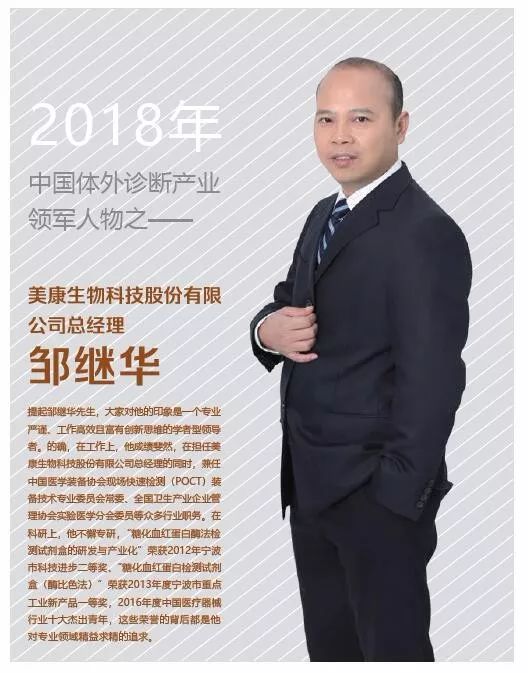 提起邹继华先生,大家对他的印象是一个专业严谨、工作高效且富有创新思维的学者型领导者。的确,在工作上,他成绩斐然,在担任美康生物科技股份有限公司总经理的同时,兼任中国医学装备协会现场快速检测(POCT)装备技术专业委员会常委、全国卫生产业企业管理协会实验医学分会委员等众多行业职务。在科研上,他不懈专研,“糖化血红蛋白酶法检测试剂盒的研发与产业化”荣获2012年宁波市科技进步二等奖,“糖化血红蛋白检测试盒(酶比色法)”荣获2013年度宁波市重点工业新产品一等奖,2016年度中国医疗器行业十大杰出青年,这些荣誉的背后都是对专业领域精益求精的追求。