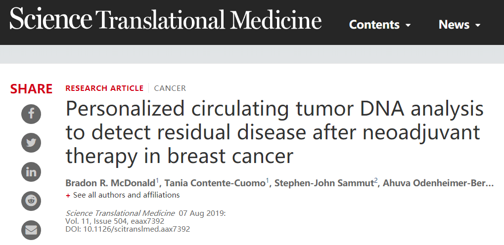 近年来,基于ctDNA的液体活检技术提供了一种发现肿瘤并分析肿瘤基因突变的非侵入性手段,并在肿瘤治疗反应监测等领域展示出广阔的应用前景。但目前,在血液中检测微量肿瘤DNA仍然存在诸多挑战,尤其是对于那些已经接受过初期化疗的患者。对于非转移性癌症患者,大多数现有方法对治疗期间或治疗结束后的残留病灶检测仍然缺乏足够的敏感性。 为了解决以上这些问题,来自美国希望之城转化基因组学研究所(TGen)、梅奥医学中心及英国剑桥大学的研究团队日前开发出一种名为“TARDIS”(TARgeted DIgital Sequencing)的新型乳腺癌液体活检方法。该方法可以准确分析乳腺癌患者在新辅助治疗期间的残留病灶,进而帮助患者避免不必要的手术,使医生能够对癌症进行持续、精确的监测。值得关注的是,这种检测方法较其他基于血液的癌症监测手段敏感100倍。研究人员在论文中写到,TARDIS在目前使用临床相关血量进行ctDNA检测的极限基础上,实现了100倍以上的改进,证明了个性化的ctDNA监测可以实现对癌症患者的个体化临床管理。相关文章于今日发表在Science Translational Medicine期刊。