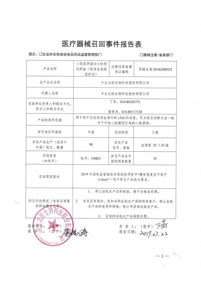 中生北控生物科技股份有限公司 报告,由于 2019年国家监督抽检发现检验项目中“膜条宽度应不低于4.5mm”一项不符合产品技术要求等原因, 中生北控生物科技股份有限公司 对其生产的 心肌肌钙蛋白I检测试剂盒(胶体金免疫层析法)(注册或备案号:京械注准20162400525)主动召回。召回级别为 三级 。涉及产品的型号、规格及批次等详细信息见《医疗器械召回事件报告表》。