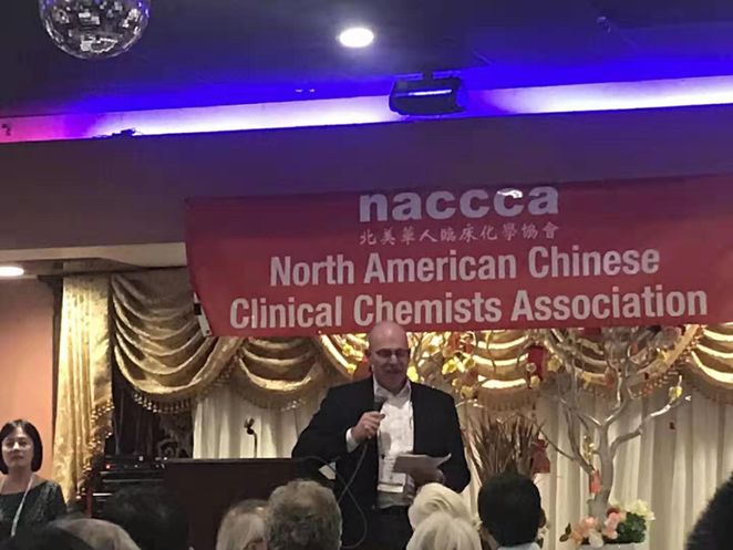 紧接着到颁奖环节,经过 NACCCA 董事会成员的严格遴选,对有贡献的前会长或业界杰出人士给予最佳贡献、服务和最佳教育等奖项。这些奖项旨用以认可他们为临检和体外诊断界做出的成绩和贡献。今年为NACCCA提供资助的企业有定向点金、西门子、KWORK、迈瑞、迈克生物、百创特生物等,对于这些企业的赞助支持,组委会和参会人员表示衷心的感谢。接下来,获奖人之一 Ruben Luo 博士做了 20 分钟精彩演讲。大家最喜欢和期待的餐后交流将会议引至高潮,大家互相交换名片、加微信。恭喜今年的成绩,互邀明年夏末芝加哥再聚!