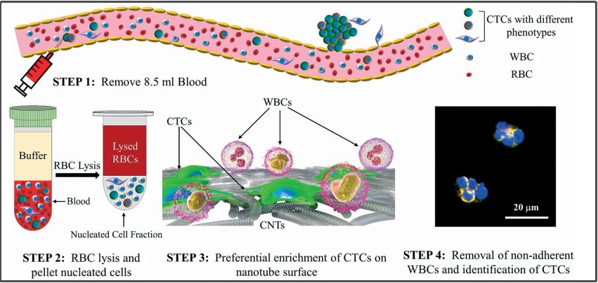 循环肿瘤细胞(CTC)是指癌症病灶“掉落”进入到外周血液的肿瘤细胞。这些细胞随血液播散后在身体的其他部位形成新的转移灶,因此与癌症的转移和复发密切相关。 由于CTC在外周血中十分稀少,因此给相关研究的开展带来了极大的难度。在肿瘤患者的血液样本中,大约每10亿个血细胞才有1个CTC。想要捕获CTC,困难程度无异于“大海捞针”! 但是,由美国伍斯特理工学院的科学家研发的一种新型液体活检芯片,或许有望改变目前这个现状。这种芯片由碳纳米管构成(nanotube-CTC-chip),能够捕获所有尺寸和类型的CTC! 值得注意的是,这项检测技术的敏感性远远超越以往技术。经验证,在乳腺癌患者的血液样本中能够100%的捕获到CTC! 利用这项技术,能够在每毫升血液中捕获0.5-28个CTC。这项研究的成果最新发表在国际一流期刊《Lab on a Chip》上。 不同细胞吸附碳纳米管示意图 如何才能高度纯化外周血液中的CTC,是科学家们一直以来都非常头疼的问题。首先,CTC数量少,在大量血液中被稀释到一个很小的浓度,而现有技术捕获效率低,因此容易遗漏一些重要类型的肿瘤细胞。 其次,其高度提纯困难,而大量血细胞,包括红细胞以及白细胞的存在,将对CTC造成污染,干扰其分析结果。 当前这项技术的研究人员发现,为了能够在人体的其他部位形成新的转移灶,CTC具有较强的吸附能力,而这一点是白细胞远远比不上的。因此,他们利用碳纳米管来清除血样中的白细胞。 碳纳米管与芯片构造 对于红细胞的处理方式是,研究人员在将血样加入芯片前就将其裂解,而裂解过程对血样中的CTC几乎完全没有影响。 新型液体活检四大操作步骤 利用荧光染料标记已知数量的肿瘤细胞对这种新型芯片进行验证,研究人员发现这种检测方法具有极高的敏感性,受试样本中89%至100%的肿瘤细胞都能被成功捕获。 而且,血液样本与碳纳米管接触的时间越长,芯片的灵敏度就越高! CTC捕获数据 在真实的乳腺癌患者(Ⅰ-Ⅳ期)中对这项技术进行验证。研究人员发现,这项技术检测CTC的敏感性为100%。所有受试乳腺癌患者的血液中都能捕获到CTC,而健康对照者的样本中则完全没有。 不仅如此,捕获到的CTC具有早期到晚期肿瘤的多种不同表型,这是其它血液检测手段所不具备的优势。这些特点表明,这项技术能够用于检测早期肿瘤、预测肿瘤的病程以及监控肿瘤的治疗效果。 当前CTC液体活检技术比较,nanotube-CTC-chip具有独特优势 研究人员强调,基于其独特的设计,nanotube-CTC-chip不仅能够高效的识别CTC,还能够用于培养捕获的CTC。 目前有一些其它研究机构和科技公司开发的CTC检测技术,但是这些技术都存在着重大的限制,例如:敏感性低、不能够追踪所有尺寸和类型的CTC、捕获细胞伴有其它污染(如白细胞)、难以从芯片中提取捕获细胞进行分析、成本过高。 与此相对的是,nanotube-CTC-chip并没有这些限制。目前,研究人员已经准备好将这项技术应用于人体临床试验,用于癌症的早期检测。结果值得期待! 参考资料 Liquid biopsy using the nanotube-CTC-chip: capture of invasive CTCs with high purity using preferential adherence in breast cancer patients DOI: 10.1039/C9LC00274J |