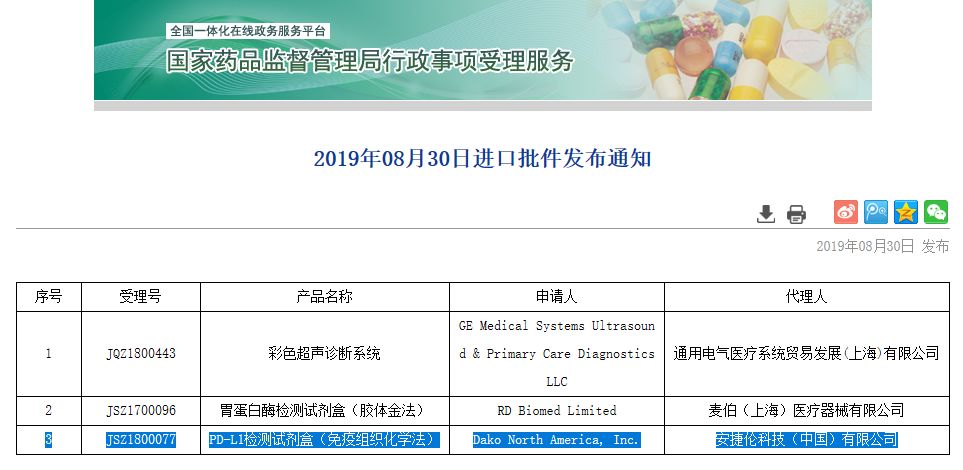 ▲2019年8月30日进口批件发布通知(来源:NMPA) 2019年8月30日,NMPA对外发布准产批件通知。通知显示:Dako North America(代理人:安捷伦科技(中国)有限公司)的“PD-L1检测试剂盒(免疫组织化学法)”正式获批上市,值得一提的是此款产品系在中国批准上市的首个PD-L1检测试剂盒。 PD-L1检测是目前筛选获益患者金标准 大量研究表明,肿瘤组织样本中PD-L1表达水平越高,则意味着患者更可能从PD-1/PD-L1抑制剂治疗中获益。肿瘤组织PD-L1表达水平评估是目前临床研究、验证和认可度最广泛的PD-1/PD-L1抑制剂疗效预测标志物。而免疫组化方法学是目前临床诊断级别评估肿瘤组织PD-L1表达水平的唯一方法学。目前FDA获批具有代表性的4种PD-1/PD-L1单抗(nivolumab、pembrolizumab、atezolizumab和durvalumab)都有相对应的伴随诊断联合使用,在临床诊疗实践中,到底是应该先选择PD-L1检测方法还是先选择治疗药物?不如,先来看看检测适应症与关联药物的比较: ▲表1:FDA/CE IVD已获批的4种PD-L1检测汇总(图片取自肿瘤资讯) 从国际上已报道的研究来看,针对以上4种PD-L1表达检测,2017年发布在《Clinical Cancer Research》杂志上的一项研究显示,SP263和22C3、28-8具有较好的一致性,在PD-L1肿瘤细胞膜染色不同阈值(1%、10%、25%和50%)的比较上,三种方法的总体一致率>90%。由国际肺癌研究协会(IASLC)发起的Blue Print 1和Blue Print 2研究显示出相似的结果。相比之下, SP142检测肿瘤细胞PD-L1表达需要更高的阈值,但在免疫细胞的检测上具有更好的敏感性,从最新的研究更新来看,SP142在需要或仅需要评估免疫细胞PD-L1表达水平的适应症上具有显著优势。值得注意的是,VENTANA PD-L1(SP263)可以同时检测细胞膜和细胞浆中的PD-L1表达,欧盟体外诊断医疗器械(CE IVD)认证批准可同时指导nivolumab、pembrolizumab和durvalumab治疗是目前国际上关联药物最多的检测。 ▲图1:非小细胞肺癌(NSCLC)组织HE染色 (20X) 及4种FDA/CE IVD认证获批PD-L1检测染色图示(20X). Hirsch, Fred R., et al. Journal of Thoracic Oncology12.2 (2017): 208-222.(图片取自肿瘤资讯) 2018年是中国免疫治疗的元年,截止目前,先后5款PD-1单抗类药物先后获批上市(默沙东、BMS、君实、信达、恒瑞医药),但5种PD-1/PD-L1抑制剂临床研究中应用的检测抗体均未在我国获得上市批准,这对于临床医生在制定治疗决策时,如何评估患者从PD-1/PD-L1单抗类药物治疗方案获益情况提出了挑战。目前,克隆号为SP263、SP142和22C3的抗体试剂在我国已进入注册申请过程,其中部分申报产品进入优先审查程序。 ▲进入优先审评阶段的PD-L1检测试剂盒(整理:Medialliance) 小结 |