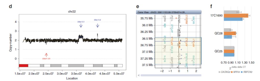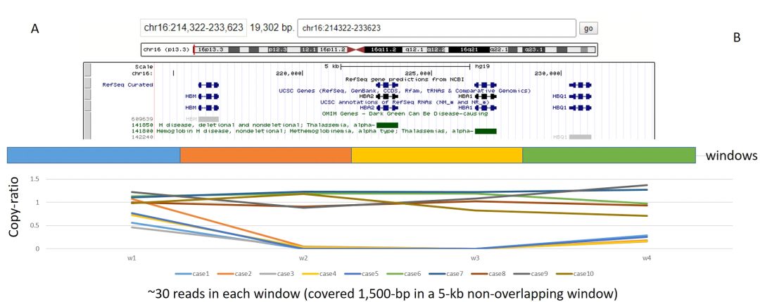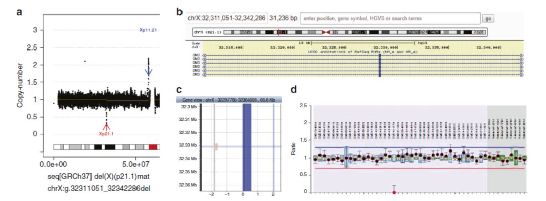 人类基因组中DNA拷贝数变异(CNV)是个体之间重要的多态性特征,并且部分CNV可导至各种疾病。以基因芯片为基础的分子细胞遗传学快速发展和临床应用大大提高了我们对疾病相关CNV的认识。另外,基因芯片对儿童患者的精确诊断有助于临床治疗干预,并且还可以对孕早期胎儿罹患基因组病(微重复微缺失综合征)进行检测,因此基因芯片是临床上疑似染色体病(如唐氏综合症)和基因组病胎儿的一线推荐检测方案。 然而,由于不同的平台、厂家、版本以及目标区域,基于探针的基因芯片性能差异很大,导至不同的实验室在遗传咨询、临床应用和验证方面存在困难。最近,通过高通量测序(NGS)平台进行CNV分析已经证明是可行的,并且能够为产前诊断提供额外的细胞遗传学信息。然而临床上CNV-seq和CMA在准确性、效率等方面还缺乏背对背研究。 最近,暨南大学医学院附属宝安妇幼保健院王辉林博士、香港中文大学董梓瑞博士等联合国内外专家对转诊至两家产前诊断中心的1023例连续产前病例同时进行了低深度全基因组测序(CNV-seq)和基因芯片(CMA)检查,以检测胎儿是否患有染色体病和/或基因组病。 采用Agilent 44K 胎儿DNA芯片v1.0以及8 X 60K 胎儿DNA芯片v2.0,分辨率为3个连续异常的探针信号。CNV-seq采用BGISeq-500单端50bp,每个样本约15M reads,杂合缺失重复分辨率为50 KB,纯合缺失分辨率为10 KB(游侠提醒这对结果很重要)。 图1 CNV-seq与CMA对1023例产前病例CNV分析流程图在1023例病例中,CMA鉴定出121例阳性结果,包括87例非整倍体异常和37例致病/可能致病CNV,整体诊断率为11.8%(121/1023)。相比而言,CNV-seq不仅检测到全部的121例阳性结果,还额外检测到17例阳性结果,整体诊断率为13.5%(138/1023)。大家一定和游侠一样好奇,究竟是哪些CNV是CMA芯片没有检测到的呢?大部分(14/17)是19.3 KB纯合缺失导至的东南亚型(SEA)α地中海贫血(如下图),这种情况会导至胎儿贫血表型,14例中有6例属于这种情况,其他8例是因为胎儿有地中海贫血家族史或前胎芯片发现异常。 第二个漏掉的CNV是一个男性胎儿在X染色体上31.2 KB的半合子缺失,该缺失导至DMD基因上一个外显子被删除(下图a红色箭头),MLPA验证了该缺失(下图d),而CMA在该区域无探针覆盖(下图c)。 第三个漏掉的CNV是298.7 KB来自母亲的杂合缺失,涉及FBN2基因上1-8号外显子(下图A红色箭头),而基因芯片在该区域只有两个探针(下图B),通过高密度基因芯片(中华8)验证了该缺失(下图C) 以上漏掉的变异都是由于芯片探针密度不高引起的,而第四个漏掉的CNV则不同,为8号染色体部分嵌合重复,嵌合比例约为23%(如下图a),刚开始CMA为正常,后来着重关注该区域时,CMA显示18%的嵌合(如下图b)。 除了上面的非整倍体异常和致病/可能致病CNV外,CMA还检测到47个VUS CNV,而CNV-seq不但全部检测到这47个还额外检测到6个VUS CNV。在这6个漏检的VUS中,4个是因为芯片探针密度不够,2个是因为低比例嵌合。一例胎儿通过CNV-seq发现新发1.4 MB的嵌合重复(如下图d红色箭头),CMA在该区域有7个探针,虽然信号都向重复端偏移(如下图e)但是并没有报告CNV,QPCR对该区域进行验证发现拷贝数信号相比正常对照提高40%(如下图f)。 本文的研究表明CNV-seq与CMA相比在CNV分析方面不分上下,并且在产前诊断应用方面超过常规CMA。考虑到较短的周转时间、更高的通量、以及更低的实验失败率和DNA量的显着降低,本研究为CNV-seq作为产前替代诊断方案提供了令人信服的证据。本文以真实的临床案例阐明了CNV-seq比CMA在检测分辨率和嵌合比例上更具优势。 |