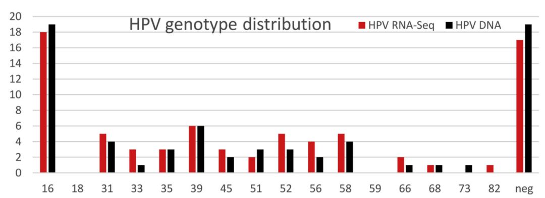 HPV RNA-Seq和HPV DNA鉴定的HPV基因型数量比较。 研究团队还利用新方法进行了HPV检测和分型,包括HPV 16、18、31、33等。同时还对检测到的所有HPV类型进行了癌前生物标志物的评估,这样对于感染多个HPV菌株的患者,就可以单独描述每种HPV基因型对宫颈癌病变的影响。研究发现,HPV特定的早期和晚期转录组reads也可作为癌前病理检测的生物标志物。 此外,研究人员将HPV RNA-Seq 与病理检测方法和分子检测进行了比较。其中分子检测是一种基于DNA芯片检测和病毒E1基因片段鉴定的CE标记试剂盒,可对18种高危型和6种低危险型HPV进行定性检测和基因分型。该试剂盒是实验室常用的HPV检测试剂盒。结果显示,HPV RNA-Seq的检测性能与常用诊断试剂盒性能相当,与病理检测也具有可比性。L1基因是HPV分型的重要基因,但在持续感染和癌前病变过程中,一旦整合到人类基因组中,该基因就有可能脱落。因此,目前的几种HPV DNA检测都是检测高危型HPV的L1基因,且使用同一种PCR引物。而HPV RNA-Seq检测HPV的所有转录组,即使 L1基因脱落,其他HPV转录信息也能被检测到。研究人员通过类似的病毒转录组信息训练并构建了回归模型。在回归模型的帮助下,研究团队发现HPV的转录组生物学特征与宫颈癌的演变有关,有助于预测宫颈病变。检测到HPV病毒并不意味着存在癌变风险,数月甚至数年的持续HPV感染是可能导至宫颈癌变的一个主要风险因素。Eliot表示:“HPV RNA-Seq是第一个结合HPV基因分型的检测方法,在癌前病变检测中具有较好的阳性预测值,并与病理检测具有可比性。”目前,研究团队计划将该方法进行商业化。但在最终实现商业化之前,该检测方法还需要在更大的队列中进行进一步的临床验证。RNA-Seq有助于观察替代基因剪接转录本、转录后修饰、基因融合、突变/SNP,以及随着时间的推移基因表达变化。研究人员表示,未来,HPV RNA-Seq将有可能成为宫颈癌筛查的二线检测手段,以减少HPV DNA检测阳性女性进行不必要的镜检。一旦在大型队列中评估了性能和医疗效益,广泛的HPV转录组检测或有可能替代临床一线的细胞学检查和DNA分子检测,并可同时进行HPV基因分型和癌前病变的分子标志物检测。1.Broad-Range Papillomavirus Transcriptome as a Biomarker of Papillomavirus-Associated Cervical High-Grade Cytology2.Transcriptome-Based HPV Assay Shows Correlation With High-Grade Cytology