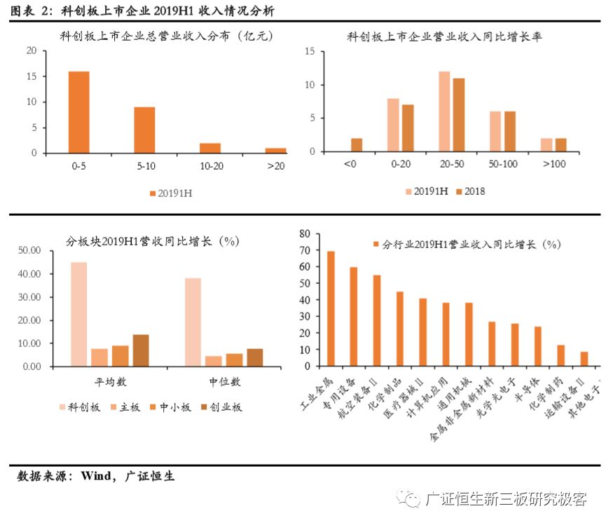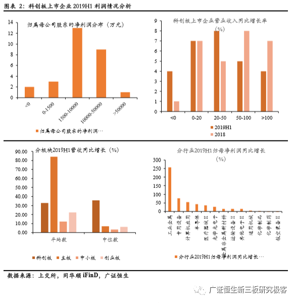 2019H1,28家科创板已上市企业快速成长。归母净利润同比增速平均值达32.84%、中位数达35.59%。按最新财报计算,28家企业PE(TTM)平均值达135.28倍,中位数为93.24倍。近一半企业PE高于100,11家企业高于75,低于100倍。PS估值法下,28家企业平均值达28.68倍,中位数达19.13倍。12家企业大于20倍,9家企业高于15倍,低于20倍。 风险提示:政策推进不及预期、市场过热、估值过高风险 引言: 截至2019年9月2日,上交所科创板已有152家企业获受理,28家企业已上市并已全部公开2019年半年度财报。通过对半年报的分析,可以得到目前科创板上市企业2019H1经营情况,包括板块行业之间的对比,以期为参与科创板的投资者提供参考。 一、152家企业获受理,共56家企业公布半年度财务数据 截至2019年9月2日,上交所科创板已有152家企业获受理,29家企业已发行,28家已上市,安博通将于近期上市。其他124家企业:新增前沿生物、天智航2家企业受理,18家处于上市审核多轮问询回复阶段,23家已问询结束。4家已审核通过,10家已报送证监会以及4家待上会。此外,有53家企业中止审查,9家终止。值得关注的是,8月31日,证监会发布公告,不予同意恒安嘉新(北京)科技股份公司首次公开发行股票注册,恒安嘉新成为首家科创板注册制下被否企业,主要原因还是在于信息披露不到位:会计基础工作薄弱和内控缺失以及未披露前期会计差错更正事项。目前共有56家企业公开2019年半年报,除已发行的29家企业全部公布,9家中止审查企业、4家待上会企业、报送证监会、已审核通过、已问询各三家企业也公开了2019H1财报,其他在审企业仅有1家或0家企业披露。注册制下,信息披露质量对企业审核是否通过起到关键作用。 二、28家已上市企业2019H1营收改善,净利润有所下沉 2019年1H 28家科创板上市企业总体平均营业收入为11.77亿元,整体营收情况改善;平均归母净利润达1.63亿元,相比2018年有所下沉。研发投入仍然较高,占营业收入12.56%。28家企业中26家企业净资产收益率大于0,工业金属和专用设备行业表现良好。 2.1 营业收入中位数为11.77亿元,同比增长明显高于同期主板中小板创业板 已发行的28家企业2019H1营业总收入平均数为11.77亿元,中位数为2.97亿元,中国通号收入最高为20.51亿元,新光光电收入6145.16亿元,低于其他企业。其中,16家企业2019H1营收收入在0-5亿元区间,3家企业营业收入超10亿元。相比2018年全年,2019年1H科创板企业营收情况转好,全部企业实现营业收入正增长,大部分企业增长率在0%-50%之间。板块方面,科创板营业收入增长明显快于主板、中小板、创业板上市企业。行业来看,目前28家科创板上市企业中,工业金属、航空装备Ⅱ和专用设备三个行业营收同比增长率中位数平均数均大于50%,计算机行业、半导体增长也较快,相较之下,运输设备Ⅱ与化学制药行业增长较慢。(行业分类为Wind 申万行业二级分类) 2.2 归母净利润中位数为6563.48万元,相比2018整体有所下沉 净利润方面, 2019H1已发行的科创板企业平均归母净利润为1.63亿元,中位数为6,563.48万元,中国通号体量最大,归母净利润最高为22.68亿元,航天宏图、铂力特净利润小于0,分别亏损2906.60万元、233.29万元。目前更多企业集中在1500万-1亿区间,也有较多企业净利润突破亿元。相比2018年,2019年1H净利润同比增长率为负的企业增加,整体有所下沉,分布有所分散。相对主板、中小板创业板,科创板的净利润增长更快。目前嘉元科技代表的工业金属行业净利润增长率平均数中位数达257.08%,华兴源创等四家企业代表的专用设备行业净利润增长率也很高,半导体计算机行业净利润增长表现可观,航空装备、通用机械行业企业出现负增长情况。(行业分类为Wind 申万行业二级分类) 2.3 研发投入中位数为3506万元,占营业收入比例平均数为12.36% 2019H1已发行科创板企业平均研发投入达6758.05 万元,中位数为3,506.38万元,中国通号、晶晨股份、澜起科技、中微公司研发费用超亿元。其中10家企业研发投入小于2500万元,10家企业在2500-5000万区间,8家投入高于5000万元。由于科创板的高新技术与战略性新兴的企业定位,企业相对研发投入较多,2019H1科创板企业研发投入占营业收入比例仍然高于其他板块。 2.4 28家企业平均ROE达10.32%,医疗器械工业金属行业大于15% 2019H1 28家上市企业中26家ROE大于0,平均数为10.32,中位数为8.47。目前较多企业净资产收益率集中在0-20%区间内,各有两家企业ROE大于20%,30%,航天宏图、铂力特小于0。行业方面,目前医疗器械、工业金属和其他电子II行业的ROE高于10%,其他行业如专用设备半导体表现也表现良好,化学制药制品、通用机械、航空装备ⅡROE相对较低。(行业分类为Wind 申万行业二级分类) 三、28家企业PE(TTM)平均值达135.28倍,中位数为93.24倍 2019H1,28家科创板已上市企业快速成长。归母净利润同比增速平均值达32.84%、中位数达35.59%。按最新财报计算,28家企业PE(TTM)平均值达135.28倍,中位数为93.24倍。近一半企业PE高于100,11家企业高于75,低于100倍。PS估值法下,28家企业平均值达28.68倍,中位数达19.13倍。12家企业大于20倍,9家企业高于15倍,低于20倍。 附表: |