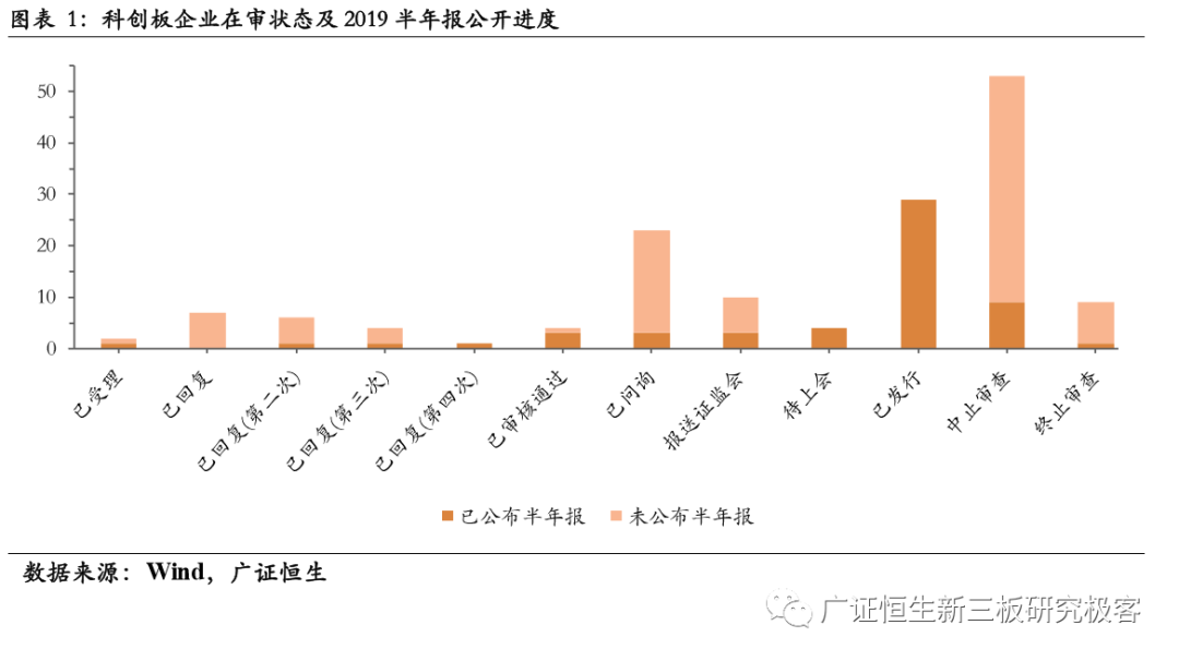 截至2019年9月2日,上交所科创板已有152家企业获受理,28家已上市,新增2家企业受理,18家处于上市审核多轮问询回复阶段,23家已问询结束。4家已审核通过,10家已报送证监会以及4家待上会。此外,有53家企业中止审查,9家终止。恒安嘉新成为首家科创板注册制下被否企业。 目前共有56家企业公开2019年半年报,除已发行的29家企业全部公布,9家中止审查企业、4家待上会企业、报送证监会、已审核通过、已问询各三家企业也公开了2019H1财报。
