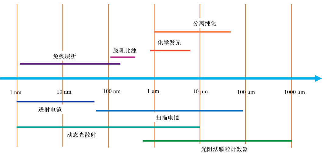 动态光散射测试粒径范围一般从0.3nm至10μm。密度较大,粒径1μm或以上的磁性微球由于在溶液中沉降速率过快,影响布朗运动,因此测试可能存在一定偏差。对于大颗粒,如磁性微球的测试,一般采用颗粒计数器进行测试。颗粒计数器一般通过测试单位时间内经过传感器的颗粒数量,及对传感器影响,进行颗粒粒径测试以及数量计数。如单颗粒光阻法传感技术,由于经过光感区域的粒子,由于大小不同,光强随之产生相应变化,将光信号转化为电信号,不同的电信号对应不同的颗粒粒径,从而得到微粒的粒径,同时还能够得到每个粒径下面颗粒的数量信息。如采用单颗粒光阻法的PSS仪器AccuSizer780,配合不同型号传感器,能够测试的粒径范围从0.5μm至5000μm,粒径分辨率达到0.01μm,是测试亚微米、微米级颗粒的重要手段。 △单颗粒光阻法测试仪测试0.7+0.8+1.3+2+5+10+15+20+50+100+200 μm多种微球混合体的粒径分布图/来源:ParticleSizingSystems 总 结 微纳米颗粒如今以及广泛应用于体外诊断领域,如何更好的表征分析微纳米颗粒的粒径,溶液中的状态,以及分析微纳米颗粒在使用过程中的问题分析有重要作用。透射电镜适用于表征50nm以下的金纳米颗粒,2-10nm的量子点;扫描电镜适用于50nm至微米级别的颗粒表面形貌;动态光散射能够测试分析0.3nm至10μm的颗粒在溶液中的状态;单颗粒光阻法颗粒计数器能够测试0.5μm以上颗粒在溶液中的状态,以及粒径分布,颗粒数量等,能够分析颗粒在特定溶液中是否聚集。具体采用什么表征手段,则需要视具体问题而定。 Reference [1]Talapin D V, Poznyak S K,Gaponik N P, et al. Synthesis of surface-modified colloidal semiconductornanocrystals and study of photoinduced charge separation and transport innanocrystal-polymer composites[J]. Physica E: Low-dimensional Systems andNanostructures, 2002, 14(1-2): 237-241. -END- |