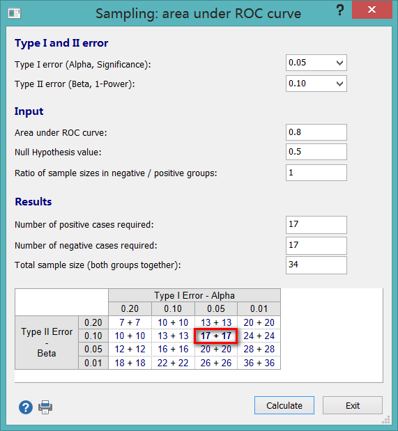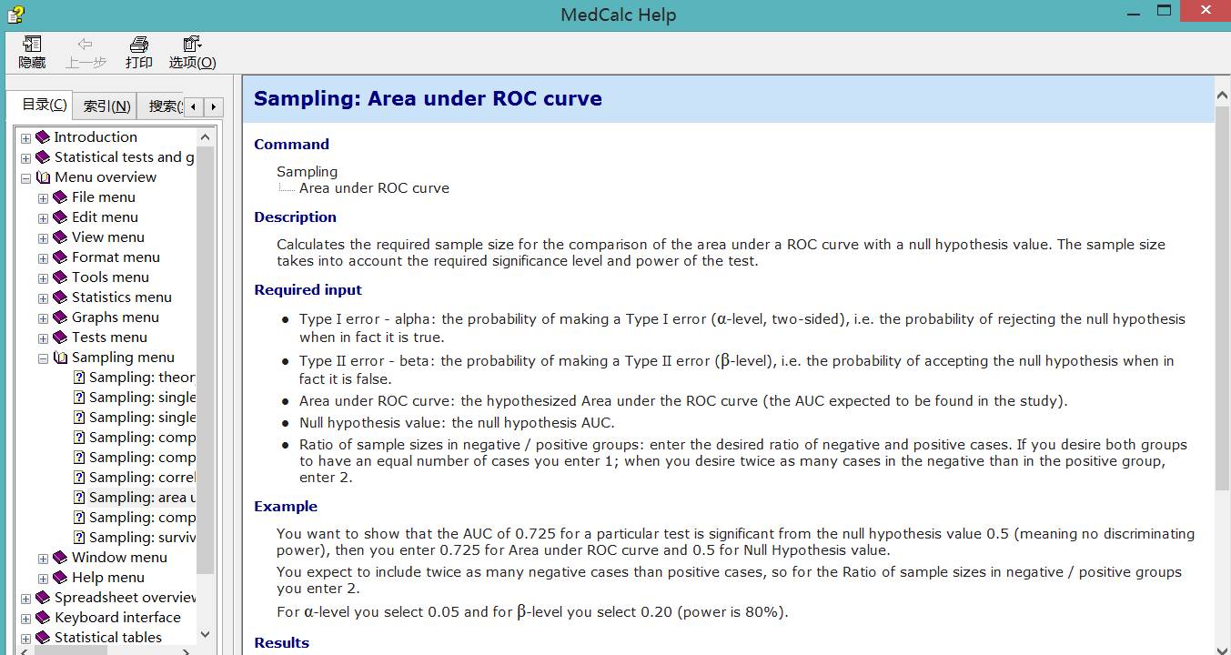 一、问题与数据 最近小宋医生在撰写一项项目书,研究设计是诊断试验,研究目的是探讨在使用呼吸机的病人中,与金标准相比,A指数预测撤机(呼吸机)失败的准确性。但是小宋医生不知道样本量怎么计算,所以跑来找小咖帮忙。 小宋医生希望该研究的ROC曲线下面积的最小值为0.80。假设α=0.05,β=0.10,预计10%的失访率,本研究拟定撤机失败的病人和撤机成功的病人数目相等,则该研究需要多大的样本量呢? 二、对问题的分析 小宋医生的研究为诊断试验,要使用ROC曲线下面积计算样本量,首先应当根据研究目的设定最小的ROC曲线下面积。然后拟定检验水准α和检验效能1-β,以及所需要的阴性组与阳性组的比例,即撤机失败的病人和撤机成功的病人之比。 根据上面的叙述得知ROC曲线下面积最少0.80,α=0.05,β=0.10,阴性组与阳性组的比例为1。 下面我们来看一下如何用Medcalc软件实现样本量计算。 三、Medcalc操作方法 1. 选择Sampling→Area under ROC curve… 2. Type I error (Alpha, Significance)中填入0.05;Type II error (Beta, 1-Power)中填入0.10;Area under ROC curve中填入最小可接受的ROC曲线下面积0.80;Null hypothesis value指零假设下即A指数无诊断价值时的ROC曲线下面积0.5(为什么ROC曲线下面积是0.5时没有诊断价值,请参考之前发过的“了解ROC曲线下面积,有这篇文章就够了”);Ratio of sample sizes in negative/positive groups:阴性组与阳性组的比值为1。点击Calculate。 计算结果见下图,在计算结果的表中找到本研究α=0.05和β=0.10对应的值,为17+17。