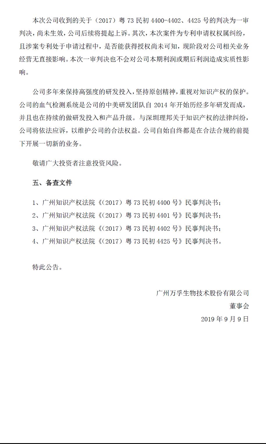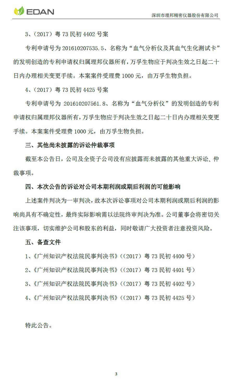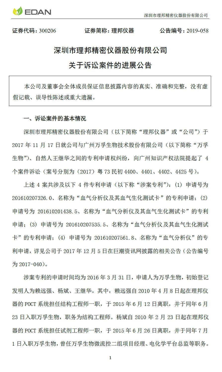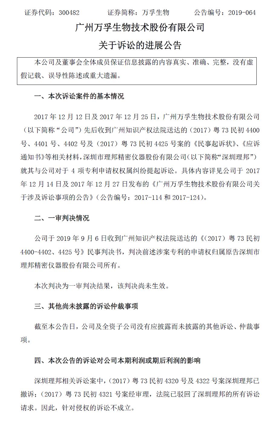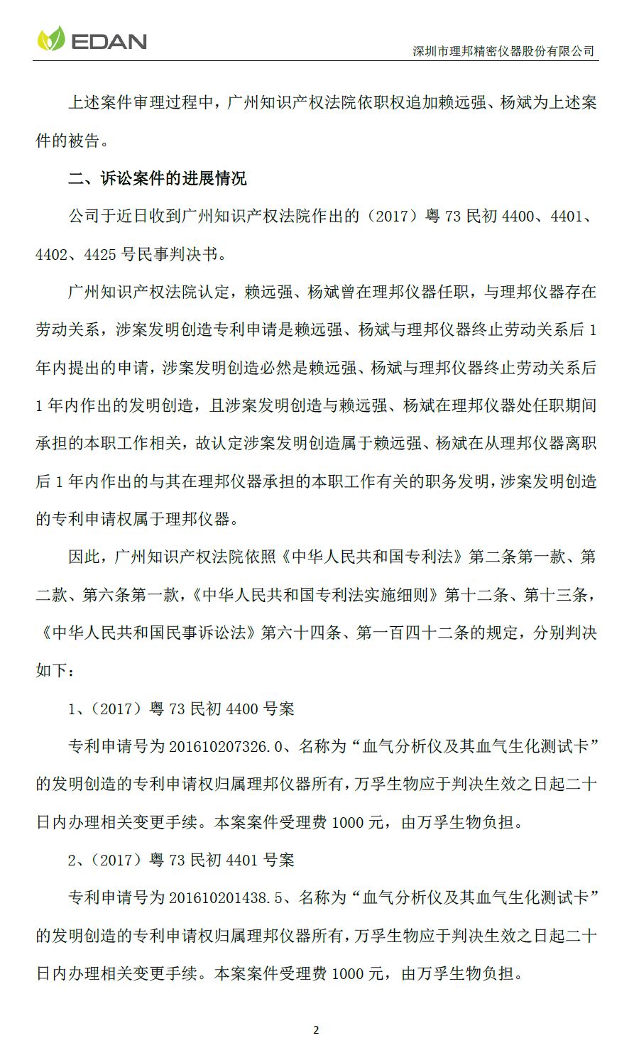 理邦仪器9月9日晚间公告披露了其2017年诉讼案件的进展。公司于2017年11月17日就公司与广州万孚生物技术股份有限公司、自然人王继华之间的专利申请权纠纷,向广州知识产权法院提起了4个案件诉讼。公司于近日收到广州知识产权法院作出的(2017)粤73民初4400、4401、4402、4425号民事判决书。上述四案共涉及4件专利申请,这4件专利申请名称为“血气分析仪及其血气生化测试卡”的发明创造的专利申请权归属理邦仪器所有,万孚生物应于判决生效之日起二十日内办理相关变更手续。本案案件受理费1000元,由万孚生物负担。其余三项受理费均由万孚生物负担。以上涉案专利的申请时间均为2016年3月31日,申请人为万孚生物,初始登记发明人为赖远强、杨斌、王继华。其中,赖远强自2010年4月8日起在理邦仪器的POCT系统担任结构工程师一职,于2015年6月12日离职,并于同年6月23日入职万孚生物,职务为结构工程师。杨斌自2010年2月23日起在理邦仪器的POCT系统担任试剂工程师一职,于2015年6月26日离职,并于同年7月1日入职万孚生物,曾任万孚生物微流控二组项目经理、电化学平台总监等职务。上述案件审理过程中,广州知识产权法院依职权追加赖远强、杨斌为上述案件的被告。广州知识产权法院认定,赖远强、杨斌曾在理邦仪器任职,与理邦仪器存在劳动关系,涉案发明创造专利申请是赖远强、杨斌与理邦仪器终止劳动关系后1年内提出的申请,涉案发明创造必然是赖远强、杨斌与理邦仪器终止劳动关系后1年内作出的发明创造,且涉案发明创造与赖远强、杨斌在理邦仪器处任职期间承担的本职工作相关,故认定涉案发明创造属于赖远强、杨斌在从理邦仪器离职后1年内作出的与其在理邦仪器承担的本职工作有关的职务发明,涉案发明创造的专利申请权属于理邦仪器。