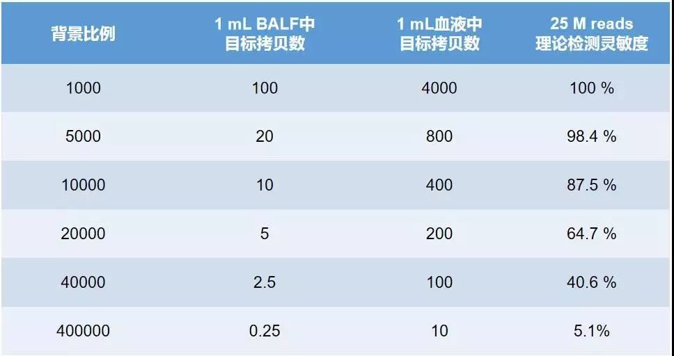 不同临床样本中所含的人源背景不一样,以肺泡灌洗液(BALF,每毫升中参考背景有核细胞数为10^5个)和血液(每毫升中参考背景细胞数为(4 ~ 10)×10^6个)为例,计算其在25M reads下含不同微生物拷贝数时的检测灵敏度。结果显示,如要达到87.5%以上的灵敏度,每毫升BALF中至少需含有10个目标拷贝数,而每毫升血液中至少需含有400个目标拷贝数。