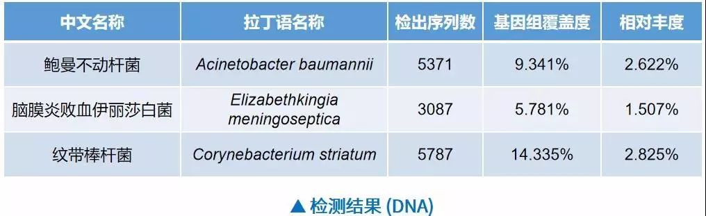 通过PDC-seq™对患者的外周血样本进行DNA检测,未发现病原体;对其肺泡灌洗液样本进行DNA检测,结果提示鲍曼不动杆菌、脑膜炎败血伊丽莎白菌和纹带棒杆菌。