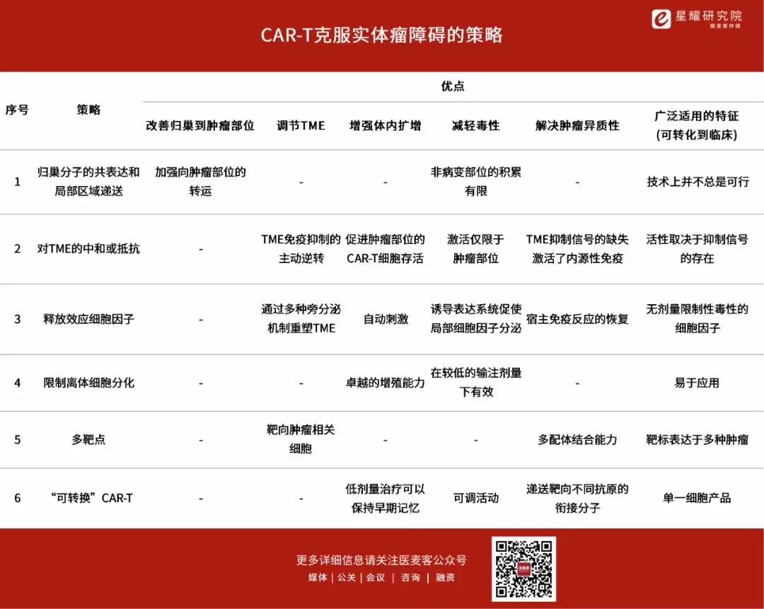 下表描述了一些CAR-T治疗实体瘤的策略,其重点是同时解决多个逃避机制并广泛适用于不同的实体瘤适应症。