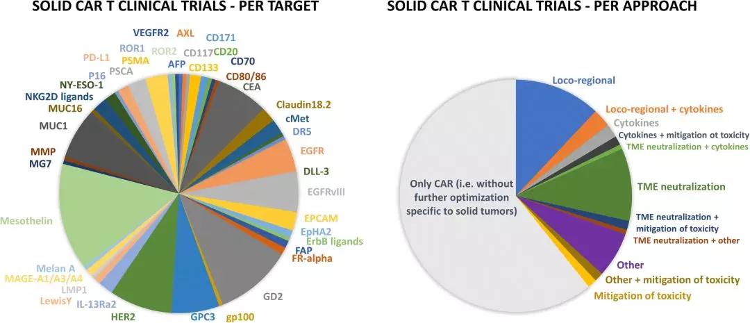 研究最多的靶点是间皮素(mesothelin)、GD2(二唾液酸神经节苷脂)、HER2(表皮生长因子受体2)、MUC1(粘蛋白1)、CEA(癌胚抗原)、GPC3(磷脂酰肌醇蛋白聚糖3)和EGFRvIII(表皮生长因子受体[EGFR]的变体III)。