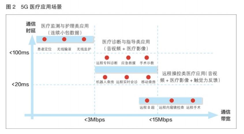 5G具备超大带宽和超高速率,用于连续广域覆盖和热点高容量场景。广覆盖场景下实现用户体验速率100 Mbps、移动性 500 Km/h,可面向基于视频与图像交互的医疗诊断与指导类应用,如实时调阅患者影像诊断信息的移动查房、采用医疗服务机器人的远程查房、远程实时会诊、应急救援指导、无线手术示教和无线专科诊断等应用场景。