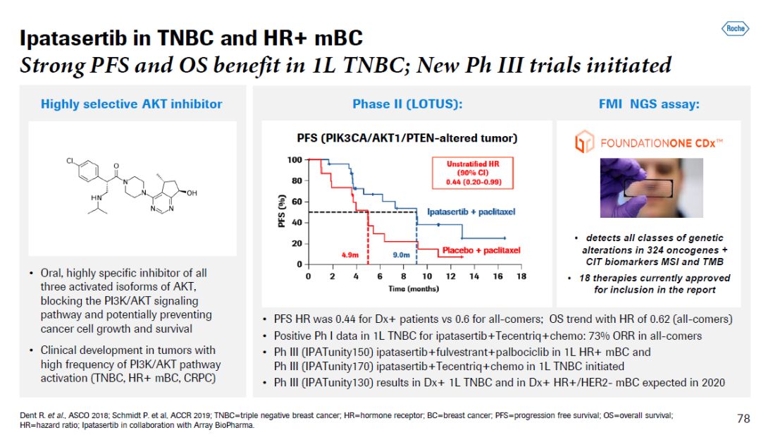 ▲Idasanutlin简介(图片来源:参考资料[1]) 在乳腺癌领域,罗氏的PD-L1抑制剂Tecentriq与化疗联用,正在成为一线治疗三阴性乳腺癌(TNBC)患者的标准疗法(SOC)。它能够提高PD-L1阳性TNBC患者的PFS和总生存期。目前,Tecentriq在多项临床试验接受检验,在不同环境下治疗TNBC患者,包括作为新辅助疗法。另一款治疗TNBC患者的在研疗法是AKT激活亚型的高度特异性口服抑制剂ipatasertib。它可以通路阻断PI3K/AKT信号通路来防止癌细胞生长和生存。罗氏在使用Foundation Medicine的分子诊断技术,发现在PI3K/AKT信号通路中出现突变的癌症患者(包括PI3KCA,AKT1, PTEN基因变异)进行治疗。在名为LOTUS的2期临床试验中,这一疗法在治疗通过分子诊断筛选的TNBC患者时,将疾病进展和死亡风险降低56%(HR=0.44)。