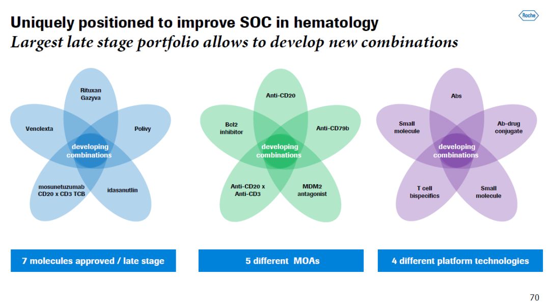 罗氏在血液学方面具有独特的优势,该公司有7款获批或处于后期临床研发阶段的创新药物,它们具有5种不同的作用机制和4种不同的平台技术。这些药物为罗氏开发创新组合疗法提供很多选择。