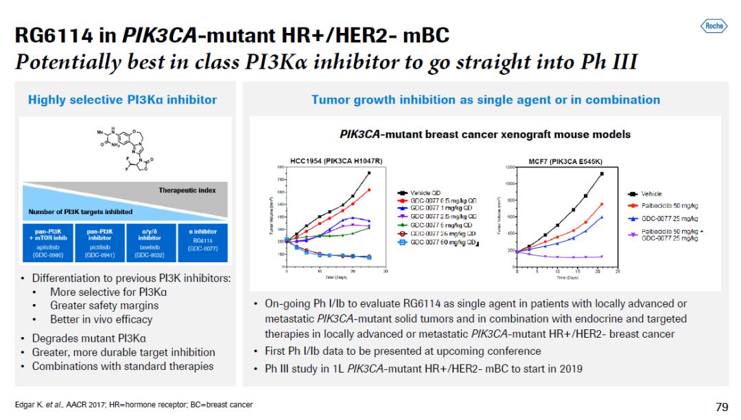 ▲Ipatasertib简介(图片来源:参考资料[1]) 这款在研疗法同时作为一线疗法,在治疗转移性去势抵抗性前列腺癌(mCRPC)患者的临床试验中表现出积极疗效。而且,PTEN基因缺失(导至PI3K/AKT信号通路激活)患者对它的反应更为明显。在靶向疗法方面,罗氏的RG6114是一款潜在“best-in-class”PI3K抑制剂。它对PI3Kα具有更高的特异性,因此具有更好的安全性特征。而且,它可以导至PI3Kα突变体被降解,从而提供强力持久的抑制效果。这款新药在1期临床试验中的表现非常积极,罗氏将直接跳过2期临床试验,在今年晚些时候开展3期临床试验,检验它在治疗携带PI3KCA基因突变的HR阳性/HER2阴性转移性乳腺癌患者中的疗效。 另一款针对HR阳性乳腺癌患者的在研疗法是特异性雌激素受体降解剂RG6171。这是罗氏开发的第三代分子,不但降解雌激素受体(ER)效力强劲,而且具有非常好的药代动力学特征。在动物模型中,它可以通过降解ER,抑制肿瘤生长,提高CDK4/6抑制剂的疗效。RG6171也已经取得了积极的1/1b期临床结果,罗氏准备直接启动3期临床试验,检验它与其它药物联用,治疗HR阳性/HER2阴性转移性乳腺癌患者时的疗效。