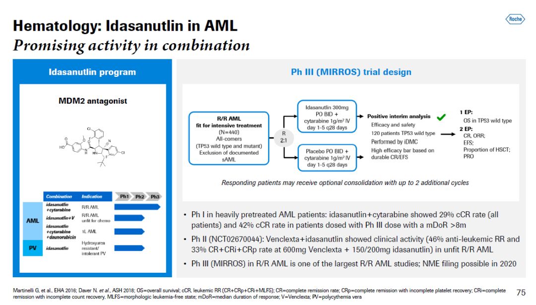 ▲抗CD20/抗CD3比例为2:1的双特异性抗体在治疗R/R侵袭性NHL患者时的临床结果(图片来源:参考资料[1]) Horning博士介绍的另一款在研疗法是MDM2拮抗剂idasanutlin。这款小分子药物通过与MDM2蛋白结合,防止MDM2介导的抑癌蛋白p53的降解,从而恢复p53的转录活性,增强p53介导的肿瘤细胞凋亡。这款具有创新作用机制的药物在1期临床试验中已经表现出良好的活性。罗氏正在进行3期临床试验,检验这一候选药物与cytarabine联用,治疗R/R急性髓系白血病(AML)患者的疗效。同时,罗氏也在探索这一候选药物与其它药物联用,治疗不同AML患者的疗效。这也再度体现了拥有多种具有不同作用机制创新疗法为开发组合疗法带来的优势。