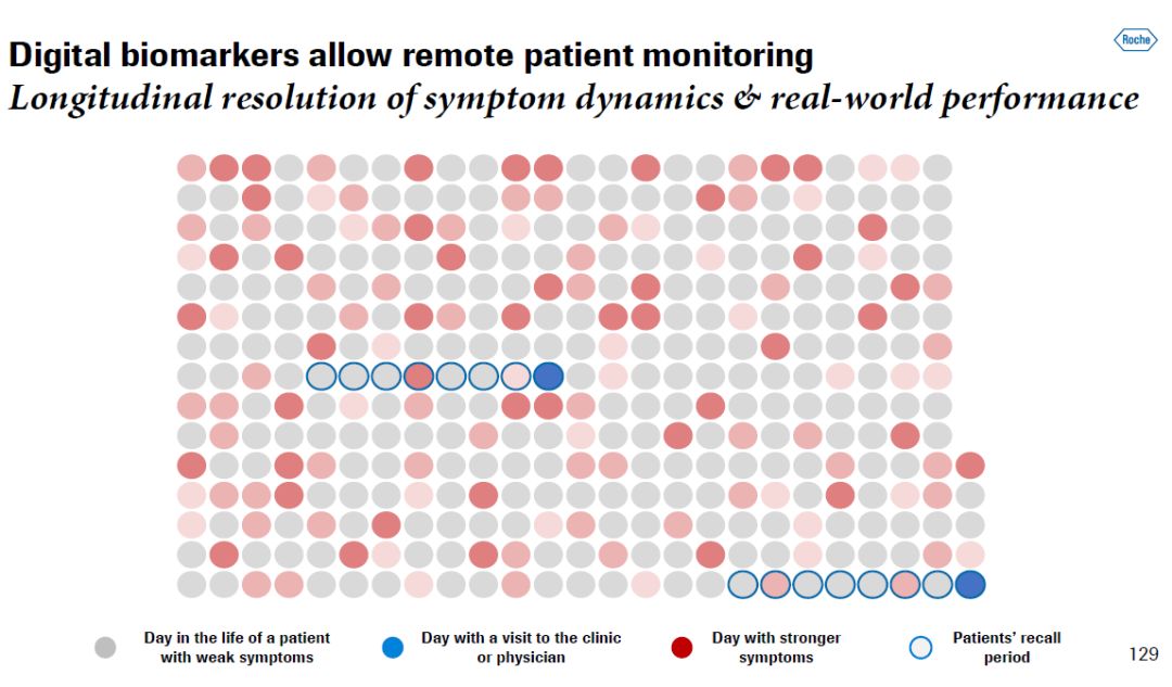 ▲Prasinezumab简介(图片来源:参考资料[1]) Fontoura博士尤其强调了数字生物标志物在治疗神经疾病的药物开发方面的重要性。他认为,困扰神经疾病药物开发的一个难点是对临床终点的检测非常困难。通常检测结果噪声很大,主观性很高,因此,要判断一款新药是否起作用,可能需要耗时很长,患者数量非常大的临床试验。如果能改变这一现状,不但对患者诊断和治疗,也对新药开发将产生显著影响。罗氏的策略是通过利用高科技产品,尤其是可佩戴设备,以更高的频率从患者那里获得更高质量的数据,通过分析这些数据来提供临床洞见。 ▲为治疗神经疾病开发数字生物标志物(图片来源:参考资料[1]) 为了说明数字生物标志物的优越性,他举了一个浅显的例子。他说,假设一个患者一年365天中通常只接受两次随访,然而他的症状每天都在变化,而患者通常只能记住一周内自己症状的变化,那么每年两次的随访对患者疾病变化的了解非常有限,并且可能不具有代表性。这对于药物开发人员来说是一场灾难。而解决这个问题的方法,他说,是在每个患者的口袋里“放一个神经内科学家”。 ▲传统随访对症状检测的局限性(图片来源:参考资料[1])罗氏的Floodlight智能手机软件能够对患者的多个指标进行被动和主动测试,从而构建新的临床终点,改善对患者的治疗模式和药物开发模式。目前,Floodlight构建的临床终点的有效性正在治疗多发性硬化症患者和帕金森患者的临床试验中接受检验。在治疗帕金森患者的临床试验中,数据显示患者使用手机软件的依附性很高,检测的可重复性很高,更重要的是手机软件产生的临床终点与传统临床终点也具有一致性。罗氏将在所有神经疾病的药物研发过程中采用数字生物标志物。Fontoura博士表示,数字生物标志物的广泛使用将有可能为神经疾病的药物研发带来革命性的变化。 ▲罗氏开发的Floodlight手机程序(图片来源:参考资料[1])