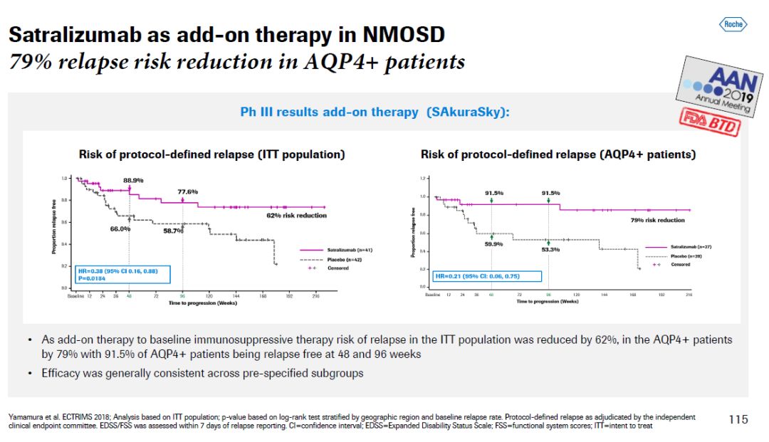 ▲Satralizumab简介(图片来源:参考资料[1]) 在临床试验中,satralizumab作为单药疗法或与其它疗法联用,都表现出良好的疗效。作为标准疗法之外的附加疗法,satralizumab在AQP4阳性患者中能够将疾病复发风险降低79%。高达91.5%的AQP4阳性患者在接受治疗后的48-96周之间没有出现复发。罗氏认为,这款疗法可能成为治疗NMOSD的一线标准疗法。