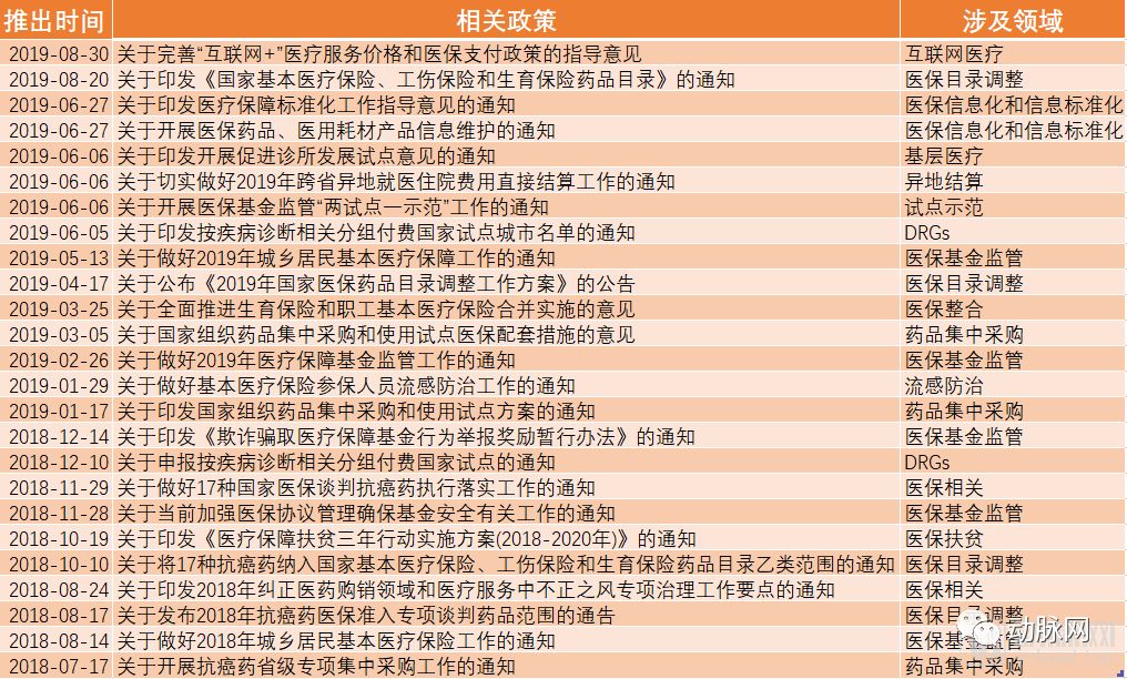 今天是国家医保局成立的第552天。 在诞生之初,国家医保局就承担着“三医联动”的使命,背负了医保控费、基金监管、信息化建设等诸多期望,体现了党中央国务院深化医疗改革的决心。时间过去了一年半,国家医保局交出了一份怎样的成绩单? 据官网数据,截至2018年末,基本医疗保险参保人数占全国总人口的95%以上,国家医保局管理着超过2万亿人民币的医保基金。作为医疗最重要的支付方,国家医保局的一举一动都将给行业带来深远的影响。 从医保目录的大调整,到药品的集中采购;从医保信息化和标准化的建设,到互联网医疗支付形式的推出;从异地就医的打通,到医保基金的控费。国家医保局的成绩不可谓不亮眼。 过去的这552天,国家医保局共推出了24项重磅政策,有122次实际动态,创新了6大领域。如果医疗是块顽疾,国家医保局就像是一个主治医生,已开始动刀。 2018年3月国务院开启机构大改革,国家医保局和其它24个部门一样,是一个新组建的部门。其它的部门都相继挂牌,而国家医保局直到5月31日,才最后一个挂牌。 这像是某种隐喻: 我们要去往的地方,路途遥远,不能放弃,更不能操之过急。 01 初心 2018年年初,国务院发布《深化党和国家机构改革方案》,国家医保局作为首个国家层面的独立医疗保障机构进入公众视野,与新组建的国家卫生健康委员会一起,承担起外界对医保、医疗、医药三医联动的期待。 医改已进入到深水区,不发挥强力的改革措施,就很难往前突破。 在过去的体制里,以往这一块的管理是分散在四个部门的手里。城镇职工、城镇居民的医保由人社部管理,新农合由卫计委管理,医疗救助由民政部管理,而医疗服务和药品价格管理在发改委。要真正统筹管理,就必须将这些职能整合,成立新的管理部门。这种整合,不仅可以使医保基金得到充分的管理和调控,还可以超级买方的身份去做降低药价、信息标准化建设、推动行业变革等一系列事情。 集中了权力,才能真正去办大事。 5月31日,国家医疗保障局正式挂牌,一局三副的领导班子也搭建完成。原财政部副部长胡静林担任首任局长,其它三位副局长是施子海、陈金甫、李滔。领导班子里的每个人都可谓大有来头。 局长胡静林是经济学博士,著(译)有《国有企业改革和途径》、《人力资本和企业制度创新》、《金融资产评估》、《美国联邦政府预算》等多部论著,在财政部副部长的岗位上分管办公厅、农业司、金融司等。 施子海是北京师范大学毕业,获得过经济学硕士学位;陈金甫的专业背景也是经济学;李滔是医学博士。 国家医保局被定位为医疗服务的主要购买者,便于更好的发挥其对医疗服务体系的发展与卫生资源的配置的决定性作用,下设“六司一办”。 随着国家医保局的正式挂牌办公,改革的利剑已出鞘。 02出手 2018年7月,《我不是药神》热播,片子里讲述的许多问题反应了大众的心声,一上映,豆瓣上直接开出了9分的评分。 针对民众反映强烈的问题,国家医保局出手了。同月,国家医保局的官网上挂出了成立以来的第一个重磅政策,《关于开展抗癌药省级专项集中采购工作的通知》。 出台这个政策的逻辑是,国家医保局手握约2万亿人民币的医保基金,在巨大的议价能力面前,通过集中采购和降税的手段,自然就将药品终端的价格降了下来。 以此作为开场,国家医保局频频出手。 据动脉网统计,在一年半的时间里,国家医保局共发布了24项重磅政策,涉及到医保信息标准化建设、互联网医疗、基层医疗、医保基金监管等诸多领域。 国家医保局成立以来出台的政策 资料来源:国家医保局官网 从这个表格中,我们可看出,国家医保局的工作主要围绕医保基金管理、医保目录调整和药品价格这三方面展开。 这三面又可具体拆分为:打击骗保套保,《医疗保障基金使用监管条例(征求意见稿)》公开征求意见;再次启动医保目录调整,建立医保目录动态调整机制;启动疾病诊断相关分组(DRG)付费国家试点工作;推进异地就医,合并生育保险和职工基本医疗保险、医保扶贫等;开展“4+7”带量采购试点,并启动第三次抗癌药品医保准入谈判等。 每一次政策的出台,都像重磅炸弹一样,在行业里引起了巨大的反响。 医疗产业链上的各企业,有的开始居安思危,有的紧急刹车,有的如鱼得水,总之,一切都指向了变革。 03变革 从国家医保局推出的政策中,我们选出政策影响最深刻的6大领域做出分析,它们分别是医保基金监管、医保目录调整、药品集中采购、医保信息化和信息标准化、互联网医疗、DRGs。 1.医保基金监管 防范基金风险,发挥基金效能,是医保工作的重要职责,加强医保基金监管更是一项需要全社会共同参与的持久战。 2018年9月起,国家医保局联合卫健委等6部门在全国范围内开展“打击欺诈骗保专项行动”,这是医保制度建立以来第一次专门打击欺诈骗保行为的全国性专项行动。随后央视曝光“沈阳骗保案”,国家医保局就在各地自查的基础上迅速开展了自查的“回头看”,并公布全国打击欺诈骗保举报电话。 2018年11月底,国家医保局发布了《关于当前加强医保协议管理确保基金安全有关工作的通知》,要求各级医保管理部门在定点申请、协议履行、费用审核、评估考核等各环节中要严格把关、加强监管,对违反协议约定骗取医保基金的行为保持高压、重拳出击。 随后的12月份国家医保