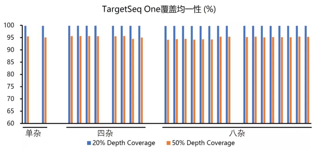 图4 位点测序深度累积分布图 那么覆盖均一性高意义在哪儿呢?覆盖均一性高,可以节省测序数据。举例来说,如果我们做的是遗传病的遗传变异检测,那么可能会要求测序数据对于目标区域的20X覆盖度达到98%,即98%的目标区域能够测20X以上的深度。如果测序数据的20%平均深度的覆盖度是98%,那么我们需要把目标区域平均深度测到100X。那么如果测序数据覆盖均一性有了较大的提升,20%平均深度的覆盖度达到了99%以上, 40%平均深度的覆盖度就达到了98%,那么我们在目标区域平均深度为50X的时候就可以达到目标区域的20X覆盖度达到98%的目标了,这样就可以节省50%的测序数据。如何实现对目标区域高度均一的覆盖呢?首先是文库的均一性,文库构建时,采用无序列偏差的DNA片段化方法,以及采用GC含量偏好性低的扩增酶,控制PCR扩增的循环数,有助于得到均一性较好的文库。由于不同序列的探针结合目标DNA片段的效率是不同的,在探针设计时需要预测探针的结合能力,并在探针合成时合理调整探针的比例,对结合能力弱的探针进行补偿。为了对目标区域进行高均一性覆盖,需要采用高度优化的杂交缓冲液和杂交实验流程进行捕获实验。卓越的技术指标是捕获测序技术的应用前提,而实验操作的简捷性则是靶向捕获技术广泛应用的必要保障,也是实验人员普遍关心的。简捷的实验操作可以大幅降低实验人员的工作量,节省实际动手操作的时间。将多管试剂在PCR仪上移液混合操作简化成单管实验操作,可以极大地简化实验操作,实验人员操作起来也更加从容。另外,多个文库混合在一个反应里进行杂交捕获,可有效降低实验成本,大幅提升实验操作效率(图5)。 艾吉泰康可以为客户提供全面覆盖DNA变异检测和表观遗传修饰检测,匹配Illumina、BGI/MGI、Ion Torrent等多个测序平台的TargetSeq OneTM液相杂交捕获技术体系,包括捕获产品的定制开发和相应的技术服务。TargetSeq One液相杂交捕获体系,采用高度优化的试剂组分和简捷的实验流程,在保证捕获效率的同时,实现了极高的覆盖均一性,具有以下显著优势: One Tube:一管杂交方案,操作简捷,所有杂交试剂在放入PCR仪之前完成混合,无需在PCR仪上进行移液操作。多个文库混合在一块进行杂交,有效降低人力成本和试剂成本。 One Round:探针设计制备一次成型,无需多轮调试优化即可保证捕获效果。 One Day:提供快速杂交的实验方案,两小时快速杂交即可达到理想效果,可大幅度缩短实验时间,只需一天即可完成建库和捕获实验。 One System:一个体系,同时支持BisCap®和MethCap®目标区域DNA甲基化捕获。采用TargetSeqOne体系,在单个文库杂交捕获,以及四个文库、八个文库混合杂交捕获的实验中(NCC癌症变异检测Panel),TargetSeq One捕获特异性(图6)和覆盖均一性(图7)均有极致的数据表现。